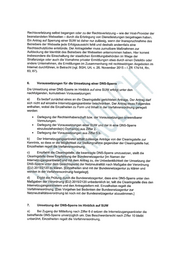 Rechtsverletzung selbst begangen oder zu der Rechtsverletzung - wie der Host-Provider der beanstandeten Webseiten — durch die Erbringung von Dienstleistungen beigetragen haben. Ein Antrag auf Sperrung einer SUW ist daher nur zulässig, wenn der Inanspruchnahme des Betreibers der Webseite jede Erfolgsaussicht fehlt und deshalb andernfalls eine Rechtsschutzlücke entstünde. Der Antragsteller muss zumutbare Maßnahmen zur Aufdeckung der Identität des Betreibers der Webseiten unternommen haben. Hier kommt insbesondere die Einschaltung der staatlichen Ermittlungsbehörden im Wege der Strafanzeige oder auch die Vornahme privater Ermittlungen etwa durch einen Detektiv oder andere Unternehmen, die Ermittlungen im Zusammenhang mit rechtswidrigen Angeboten im Internet durchführen, in Betracht (vgl. BGH, Urt. v. 26. November 2015 -1ZR 174/14, Rn. 83, 87). 6. Voraussetzungen für die Umsetzung einer DNS-Sperre Die Umsetzung einer DNS-Sperre im Hinblick auf eine SUW. ‚erfolgt, unter den nachfolgenden, kumulativen Voraussetzungen: a) Es bedarf zunächst eines an die Clearingstelle gerichteten’Antrags. Der Antrag darf sich nicht auf einzelne Internetzugangsanbieter beschränken. Der Antrag muss Folgendes enthalten, wobei die Einzelheiten zu Form und Inhalt in. der. Verfahrensördnung geregelt werden: e Darlegung der Rechteinhaberschaft bzw. der Voraussetzungen: ‘anwendbarer Vermutungen. e Darlegung der Voraussetzungen einer SUW und der in eine DNS-Sperre einzubeziehende(n) Domain(s) aus Ziffer 2. « Darlegung der Voraussetzungen aus Ziffer 5 b. b) Der Internetzugangsanbieter erhält zulässige Anträge von der Clearingstelle zur Kenntnis, so dass er die Möglichkeit zur: Stellungnahme gegenüber der Clearingstelle hat. Einzelheiten regelt die Verfahrensordnung: c) Empfiehlt die Clearingstelle, ‚die beantragte DNS-Sperre umzusetzen, stellt die Clearingstelle diese‘ Empfehlung der Bündesnetzagentur [im Namen der Internetzugangsanbieter] und mit.dem Antrag zu, die Unbedenklichkeit der Umsetzung der DNS-Sperre unter dem Gesichtspunkt der Netzneutralität nach Maßgabe der Verordnung (EU) 2015/2120 zu klären. [Einzelheiten sind mit der Bundesnetzagentur zu klären und werden i in der Verfahrensordnung: ‚festgelegt]. d) Ergibt die.Prüfung.durch die Bundesnetzagentur, dass eine DNS-Sperre unter den Maßgaben der-Verordnung (EU) 2015/2120 unbedenklich ist, teilt die Clearingstelle dies den Internetzugangsanbietern und den Antragstellern mit. Einzelheiten regelt die Verfahrensordnung.-[Das Vorgehen bei Bedenken der Bundesnetzagentur zur Netzneutralitätsverordnung ist noch mit der Bundesnetzagentur abzustimmen. 7. Umsetzung der DNS-Sperre im Hinblick auf SUW a) Bei Zugang der Mitteilung nach Ziffer 6 d setzen die Internetzugangsanbieter die betreffende DNS-Sperre unverzüglich um. Das Beschwerderecht nach Ziffer 10 bleibt unberührt. Einzelheiten regelt die Verfahrensordnung.