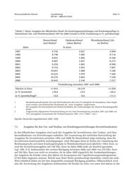Wissenschaftliche Dienste Ausarbeitung Seite 11 WD 09 – 3000-013/2010 Tabelle 7: Reine Ausgaben der öffentlichen Hand1 für Kindertageseinrichtungen und Kindertagespflege in Deutschland, Ost- und Westdeutschland 1997 bis 2006 (Anzahl in EUR; Veränderung in %; preisbereinigt) Deutschland Ostdeutschland Westdeutschland (oh- 2 (mit Berlin) (ohne Berlin) ne Berlin) Jahre In Euro 1997 8.792 2.027 5.958 1998 8.798 1.905 6.114 1999 8.831 1.882 6.184 2000 8.887 1.857 6.273 2001 9.254 1.881 6.589 2002 9.753 1.953 7.007 2003 10.051 1.988 7.246 2004 10.223 1.978 7.440 2005 10.376 2.063 7.530 2006 10.443 2.146 7.517 Veränderung zwischen 1997 und 2006 Absolut in Euro +1.651 +0,119 +1.559 in % (nominal) +18,8 +5,9 +26,2 3 in % (preisbedingt) +4,8 -6,6 +11,3 1 Haushaltsunterabschnitte 454 und 464/Funktionen 264 und 274 abzüglich der Einnahmen; diese Ergeb- nisse werden vom Statistischen Bundesamt als „reine Ausgaben“ ausgewiesen. 2 Die Ausgaben für Deutschland (mit Berlin) beinhalten die Aufwendungen der obersten Bundesjugendbe- hörde. 3 Aufgrund der allgemeinen Preisentwicklung ist von einer Preissteigerung zwischen 1997 und 2006 von 13% auszugehen; Gesamtindex für Verbraucherpreise 1997 = 97,1; 2006 = 110,1. (Quelle: Deutsches Jugendinstitut 2007: 229) 7.2. Ausgaben für den Um- und Neubau von Kindertageseinrichtungen (Investitionskosten) In den öffentlichen Ausgaben sind auch die Ausgaben für Investitionen, also Umbau- und Neu- baumaßnahmen von Einrichtungen enthalten. Die Auswertung der zeitlichen Entwicklung der Ausgaben für Investitionen zwischen 1992 und 2006 für Deutschland zeigt eindeutig, dass die Investitionen kontinuierlich zurückgegangen sind: Betrugen diese in Zeiten der Umsetzung des Rechtsanspruchs auf einen Kindergartenplatz in Westdeutschland noch jährlich 1 Mrd. Euro, so sind die Investitionsausgaben mit 196 Mio. Euro im Jahre 2006 mehr als deutlich gesunken (vgl. Abb. 9.3). Insbesondere der weitere Rückgang zwischen 2004 und 2005 von 235 Mio. Euro auf 192 Mio. Euro war nicht zu erwarten, da im Jahre 2005 eigentlich die Ausbaubemühungen der Angebote für Kinder unter drei Jahren als Konsequenz des Tagesbetreuungsausbaugesetzes (TAG) hätte beginnen müssen. Würde man diese Werte preisbereinigt darstellen, würde der reale Wert erheblich höher als der hier dargestellte nominale Rückgang ausfallen. Offensichtlich wird also die Ausweitung des Angebotes insbesondere für Kinder im Alter von unter drei Jahren in der