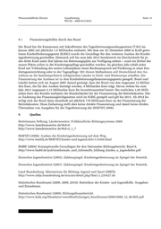 Wissenschaftliche Dienste Ausarbeitung Seite 13 WD 09 – 3000-013/2010 8.1. Finanzierungshilfen durch den Bund Der Bund hat die Kommunen seit Inkrafttreten des Tagesbetreuungsausbaugesetzes (TAG) im Januar 2005 mit jährliche 1,5 Milliarden entlastet. Mit dem am 16. Dezember 2008 in Kraft getre- tenen Kinderförderungsgesetz (KiföG) wurde die Grundlage für den weiteren Ausbau der Kinder- tagesbetreuung geschaffen. Demnach soll bis zum Jahr 2013 bundesweit im Durchschnitt für je- des dritte Kind unter drei Jahren ein Betreuungsplatz zur Verfügung stehen – rund ein Drittel der neuen Plätze sollen in der Kindertagespflege geschaffen werden. Im gleichen Jahr erhält jedes Kind mit Vollendung des ersten Lebensjahres einen Rechtsanspruch auf Förderung in einer Kin- dertageseinrichtung oder in der Tagespflege. Mit diesen Maßnahmen soll Deutschland den An- schluss an die familienpolitisch erfolgreichen Länder in Nord- und Westeuropa schaffen. Die Finanzierung des Ausbaus ist in dem Kinderbetreuungsfinanzierungsgesetz geregelt. Bund und Länder hatten sich im August 2007 darauf geeinigt, dass der Bund von den insgesamt 12 Milliar- den Euro, die für den Ausbau benötigt werden, 4 Milliarden Euro trägt. Davon stehen bis zum Jahr 2013 insgesamt 2,15 Milliarden Euro für Investitionsmittel bereit. Die restlichen 1,85 Milli- arden Euro des Bundes entlasten die Bundesländer bei der Finanzierung der Betriebskosten. Die- se Änderung des Finanzausgleichgesetzes wird im KiföG geregelt und gilt bis 2013. Ab 2014 be- teiligt sich der Bund dann dauerhaft mit jährlich 770 Millionen Euro an der Finanzierung der Betriebskosten. Diese Entlastung stellt aber keine direkte Finanzierung und damit keine direkte Übernahme von Ausgaben für die Tagesbetreuung dar (BMFSFJ 2008). 9. Quellen Bertelsmann Stiftung. Ländermonitor. Frühkindliche Bildungssysteme 2009. http://www.laendermonitor.de/#id=0 http://www.laendermonitor.de/#id=2_1_7 BMFSFJ (2008). Ausbau der Kindertagesbetreuung auf dem Weg. http://www.bmfsfj.de/BMFSFJ/kinder-und-jugend,did=113450.html BMBF (2004): Konzeptionelle Grundlagen für den Nationalen Bildungsbericht, Band 6. http://www.bmbf.de/pub/nonformale_und_informelle_bildung_kindes_u_jugendalter.pdf Deutsches Jugendinstitut (2005). Zahlenspiegel. Kindertagesbetreuung im Spiegel der Statistik. Deutsches Jugendinstitut (2007). Zahlenspiegel. Kindertagesbetreuung im Spiegel der Statistik. Land Brandenburg. Ministerium für Bildung, Jugend und Sport (MBFJ). http://www.mbjs.brandenburg.de/sixcms/detail.php/lbm1.c.235427.de Statistisches Bundesamt (2008, 2009, 2010): Statistiken der Kinder- und Jugendhilfe. Ausgaben und Einnahmen. Statistisches Bundesamt (2009). Bildungsfinanzbericht. http://www.kmk.org/fileadmin/veroeffentlichungen_beschluesse/2009/2009_12_09-Bifi.pdf