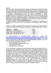Spandau Dem Senat liegen Daten über öffentlich-zugängliche Ladestandorte im öffentlichen Raum Berlins vor. Die Ladeinfrastrukturbetreiber Allego GmbH, E.ON Drive Infrastructure GmbH und Vattenfall Smarter Living GmbH betreiben 629 Ladeeinrichtungen mit insgesamt 1.206 Ladepunkten im öffentlichen Raum. Zudem werden im Rahmen eines befristeten Projektes 24 proprietäre Laternenladepunkte durch die ubitricity Gesellschaft für verteilte Energiesysteme mbH im öffentlichen Raum betrieben. Über durch private Akteure errichtete öffentlich zugängliche Standorte auf privatem Grund (d.h. im privat bewirtschafteten Straßenland, z.B. auf Supermarktparkplätzen, Tankstellenflächen und in Parkgaragen) liegen dem Senat keine eigenen Informationen vor. Hier wird auf die Webseite des Berliner Energieatlas verwiesen (https://energieatlas.berlin.de/). In Spandau befinden sich 24 Ladeeinrichtungen mit insgesamt 47 Ladepunkten im öffentlichen Raum, deren Standorte in der Übersicht in der beigefügten Anlage aufgelistet werden. An den im Folgenden aufgelisteten drei Standorten in Spandau hat die Allego GmbH im Auftrag des Landes öffentlich-zugängliche Ladepunkte im halböffentlichen Raum errichtet: Betreiber Adresse PLZ Allego GmbH Graetschelsteig 2 13595 Allego GmbH Brunsbütteler Damm 40 13581 Allego GmbH Gartenfelder Str. 104 13599 Im Ladesäulenregister der Bundesnetzagentur (BNetzA), zu finden unter https://www.bundesnetzagentur.de/DE/Sachgebiete/ElektrizitaetundGas/Unternehmen_Ins titutionen/HandelundVertrieb/Ladesaeulenkarte/Ladesaeulenkarte_node.html, mit Stand vom 06. Januar 2021 sind darüber hinaus die folgenden Betreiber registriert, die auch in Spandau öffentlich-zugängliche Ladepunkte betreiben: · Lidl Dienstleistung GmbH & Co. KG · Berliner Stadtwerke EnergiePartner GmbH · Total Deutschland GmbH · Vattenfall Smarter Living GmbH Zu den nicht öffentlich-zugänglichen Ladeeinrichtungen liegen dem Senat keine Zahlen vor, mit Ausnahme der Ladeeinrichtungen, welche durch landeseigene Betriebe auf den jeweiligen Betriebsflächen auch in Spandau errichtet und betrieben werden. Für weitere Informationen zu den von landeseigenen Betrieben errichteten Ladeeinrichtungen wird auf die Antwort auf die Frage 2 vom 7. Juli 2020 zur Schriftlichen Anfrage Nr. 18/24010 und auf die Antwort auf die Frage 3 vom 1. Oktober 2019 zur Schriftlichen Anfrage Nr. 18/21230 verwiesen. Zudem liegen die Zahlen von Ladeeinrichtungen vor, die auf Liegenschaften des Senates und der Bezirksverwaltungen in Betrieb genommen wurden. Für weiterführende Informationen zu den auf Senats- und Bezirksliegenschaften betriebenen Ladeeinrichtungen wird auf die Antwort auf die Frage 4 vom 10. August 2020 zur Schriftlichen Anfrage Nr. 18/24306, auf die Antwort auf die Fragen 3 und 4 vom 23. September 2019 zur Schriftlichen Anfrage Nr. 18/20993 und auf die Antwort auf die Frage 5 vom 11. August 2019 zur Schriftlichen Anfrage Nr. 18/20382 verwiesen. 9