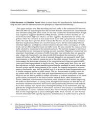 Wissenschaftliche Dienste Dokumentation Seite 10 WD 5 - 3000 - 044/21 Gilles Duranton und Matthew Turner haben in einer Studie die amerikanische Verkehrsentwick- lung der Jahre 1983 bis 2003 analysiert und gelangen zu folgender Einschätzung: 11 „This paper analyzes new data describing city level traffic in the continental US between 1983 and 2003. By exploiting the fact that our data describe urbanized and non-urbanized area interstates along with urban roads, we not only confirm the ‘fundamental law of high- way congestion’ suggested by Downs (1962), but also provide evidence that this law ex- tends beyond urban highways. That is, our data suggests a ‘fundamental law of road con- gestion’ where the extension of most major roads is met with a proportional increase in traffic. Not only do we provide direct evidence for this law, but also show find evidence that three implications of this law; near flat demand curve for the relationship between interstate highways and highway vehicle kilometers traveled (vkt), convergence of traffic levels, and no effect of public transit on traffic levels. We also consider the sources of new traffic elicited by extensions to the interstate network. We find that changes to individual driving behavior and increases in trucking are most important. Migration is somewhat less important. Surprisingly, diversion of traffic from other road networks does not appear to play a large role. Importantly, our data provide little evidence that extensions of public transit will reduce traffic. High levels of induced demand do not necessarily imply that improvements to the highway system are not in the public interest. However, our calcula- tions suggest that an average extension of the interstate network does not result in suffi- cient travel time improvements to justify its cost. Two caveats apply here. First, our wel- fare calculation excludes some possible external benefits unrelated to travel time savings. Second, certain specific improvements of the system, for example inexpensive improve- ments to bottlenecks, may well be justified even if an across the board expansions are not. A similar comment applies to public transit. The fact that increases in public transit do not reduce traffic does not imply that such improvements are not in the public interest. While we are not able to perform a welfare calculation to evaluate extensions to bus based public transit, we suspect on the basis of earlier research (Kain, 1999, Duranton and Turner, 2008) that improvements to bus-based public transit are often welfare improving. We make two final remarks in closing. First, throughout our analysis we find that our in- strumental variables estimations show find a similar relationship between roads and traf- fic as does ordinary least squares (ols). Positing the validity of our instruments, this sug- gest that the assignment of roads to metroulated statistical areas (msas) is unrelated to traf- fic (conditional on control variables). If true, this almost certainly results in lower welfare than would assigning roads to places with higher traffic levels. Second, we note that this research eliminates both capacity expansions and extensions to public transit as policies 11 Gilles Duranton /Matthew A. Turner, The Fundamental Law of Road Congestion: Evidence from US Cities, Na- tional Bureau of economic Research, 1050 Massachusetts Avenue Cambridge, MA 02138 September 2009, Work- ing Paper 15376, S. 42 f.. https://www.nber.org/system/files/working_papers/w15376/w15376.pdf.