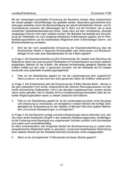 Landtag Brandenburg Drucksache 7/786 Mit der notwendigen grundhaften Erneuerung der Bauwerke müssen diese entsprechend der aktuell gültigen Vorschriftenlage neu gestaltet werden. Besondere geometrische Aus- wirkungen entstehen durch die Berücksichtigung der aktuell erforderlichen Schutz- und Si- cherheitsräume zwischen den Gleisanlagen der S- Bahn und der Fernbahn, die zu einer erheblichen Gleisabstanderweiterung führen. Diese kann auf dem vorhandenen, ehemals viergleisigen Planum nicht mehr realisiert werden. Der Betreiber hat deshalb eine Verschie- bung der mittlerweile nur noch eingleisig betriebenen S-Bahnstrecke geplant und im Plan- feststellungsverfahren auf die bedarfsweise Möglichkeit einer S-Bahnseitigen Damm- und Brückenerweiterung verwiesen. 2. Sind bei der noch ausstehenden Erneuerung der Eisenbahnüberführung über die Schönerlinder Straße in Zepernick Brückenpfeiler oder Stützmauern und Brückenwi- derlager für ein oder zwei Gleisüberbauten für die S-Bahn geplant? zu Frage 2: Die Eisenbahnüberführung (EÜ) Schönerlinder Str. besteht nach Abschluss der Maßnahme neben den zwei einzelnen Überbauten im Fernbahnbereich aus einem weiteren eingleisigen Überbau für die S-Bahn, der ehemals fernbahnseitig gelegene Überbau der S-Bahn entfällt aus den unter 1) genannten Gründen. Auf der Westseite der EÜ besteht konstruktiv eine potentielle Erweiterungsmöglichkeit. 3. Falls nur ein Gleisüberbau geplant ist, hat die Landesregierung dem zugestimmt? Wenn ja warum, wo das doch den oben genannten Zielen der Koalition widerspricht? zu Frage 3: Die Entscheidung über die Erneuerung der S-Bahn-Strecke Berlin - Bernau in der jetzt realisierten Form wurde, entsprechend den üblichen Planungsprozessen und den hierfür erforderlichen Zeitbedarfen, nicht in der aktuellen Legislaturperiode, sondern bereits Jahre vorher getroffen. Die im Oktober 2019 im Koalitionsvertrag formulierten Ziele der ak- tuellen Regierungskoalition waren zu diesem Zeitpunkt nicht bekannt. 4. Falls nur ein Gleisüberbau geplant ist: Ist die Landesregierung bereit, einen Baustopp und Umplanung zu veranlassen, um wenigstens in diesem Bereich die künftige Zwei- gleisigkeit als Voraussetzung für den stabilen 10-Minuten-Takt ohne spätere Mehrko- sten und erneute Gleissperrungen zu ermöglichen? zu Frage 4: Da das Baurecht vorliegt und keine Abweichungen davon erkennbar sind, wel- che einen derart drastischen Eingriff in den laufenden Realisierungsprozess rechtfertigen, ist die Forderung eines Baustopps aus vorgenannten Gründen rechtlich nicht durchsetzbar und zudem auch unverhältnismäßig. Es wäre unverantwortlich, den dringenden Bedarf der Brückenerneuerung zu Lasten einer perspektivischen Möglichkeit weiter zu ignorieren, zumal einer bedarfsweisen Nachrüstung einer weiteren Brücke auf der Westseite technisch-konstruktiv nichts entgegensteht. 5. Wann ist ein durchgehender 10 Minutentakt auf dieser Strecke geplant? -2-