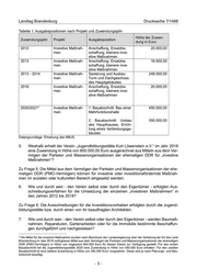 Landtag Brandenburg Drucksache 7/1488 Tabelle 1: Ausgabepositionen nach Projekt und Zuwendungsjahr Höhe der Zuwen- Zuwendungsjahr Projekt Ausgabeposition dung in Euro 2012 Investive Maßnah- Anschaffung, Ersatzbe- 20.000,00 men schaffung, kleinere inve- stive Maßnahmen 2013 Investive Maßnah- Anschaffung, Ersatzbe- 16.000,00 men schaffung, kleinere inve- stive Maßnahmen 2013 - 2014 Investive Maßnah- Sanierung und Ausbau 248.000,00 men Turm und Dachgeschoss des Hauptgebäudes 2016 Investive Maßnah- Anschaffung, Ersatzbe- 20.000,00 men schaffung, kleinere inve- stive Maßnahmen 3 2020/2021 Investive Maßnah- 1. Bauabschnitt: Bau einer 450.000,00 men Mehrfunktionshalle 2. Bauabschnitt: Umbau 350.000,00 des Haupthauses, Errich- tung eines Verbindungsge- bäudes Datengrundlage: Erhebung des MBJS. 5. Weshalb erhielt der Verein „Jugendbildungsstätte Kurt Löwenstein e.V.“ im Jahr 2018 eine Zuwendung in Höhe von 800.000,00 Euro ausgerechnet aus Mitteln aus dem Ver- mögen der Parteien und Massenorganisationen der ehemaligen DDR für „investive Maßnahmen“? Zu Frage 5: Die Mittel aus dem Vermögen der Parteien und Massenorganisationen der ehe- maligen DDR (PMO-Vermögen) können für investive oder investitionsfördernde Maßnah- men im sozialen oder kulturellen Bereich eingesetzt werden. 6. Wie und durch wen - den Verein selbst oder durch den Eigentümer - erfolgten Aus- schreibungsverfahren für die Umsetzung der einzelnen „investiven Maßnahmen“ in den Jahren 2012 bis 2018? Zu Frage 6: Die Ausschreibungen für die Investitionsvorhaben erfolgten durch die Jugend- bildungsstätte bzw. durch einen von ihr beauftragten Architekten. 7. Wie und durch wen - den Verein selbst oder durch den Eigentümer - werden Baumaß- nahmen, Reparaturen, Gartenarbeiten oder für die Immobilie bestimmte Beschaffun- gen durchgeführt und nachgewiesen? 3 Die Mittel für die investive Maßnahme wurden nach Beschluss der Landesregierung über die Verteilung der für das Land Brandenburg im Jahr 2018 verfügbaren Mittel aus dem Vermögen der Parteien und Massenorganisationen der ehemaligen DDR (PMO-Vermögen) in Höhe von insgesamt 800.000 Euro für diesen Zweck zur Verfügung gestellt. Für den ersten Bauabschnitt hat die Jugendbildungsstätte 2020 eine Zuwendung in Höhe von 450.000 Euro erhalten. Für den zweiten Bauabschnitt ist eine weitere Zuwendung in Höhe von 350.000 Euro vorgesehen. Diese wird je nach Planungs- und Bau- fortschritt bewilligt. -3-