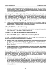 Landtag Brandenburg Drucksache 7/1488 14. Wie stellt die Landesregierung sicher, dass Zuwendungen für nicht oder nicht vollstän- dig durchgeführte Projekte, die von der Landesregierung finanziell unterstützt wurden und in der Jugendbildungsstätte „Kurt Löwenstein“ umgesetzt werden sollten, entspre- chend zurückgefordert werden können? Zu den Fragen 13 und 14: Bedingt durch die Schließungsverfügung konnten Projekte der außerschulischen Jugendbildung und der internationalen Jugendarbeit nicht stattfinden. Die dafür eingeplanten Fördermittel werden durch das Ministerium für Bildung, Jugend und Sport nicht zurückgefordert, da die Möglichkeit besteht, diese Projekte zu einem späteren Zeitpunkt im Verlauf des Jahres durchzuführen. Der Zuwendungsempfänger für die Durch- führung dieser Projekte ist die “Jugendbildungsstätte Kurt Löwenstein”. 15. Hat der Verein „Jugendbildungsstätte Kurt Löwenstein e.V.“ in Brandenburg wegen ei- nes eventuellen Wegfalles der oben aufgezählten Einnahmen Covid19-Soforthilfen be- antragt? (Wenn ja, in welcher Höhe wurden diese bewilligt?) Zu Frage 15: Soforthilfen wurden nicht beantragt. 16. Wie viele Personen, vor allem Beschäftigte, halten sich in der Jugendbildungsstätte „Kurt Löwenstein“ in der Regel zu Geschäftszeiten auf? Zu Frage 16: Dazu liegen der Landesregierung keine Informationen vor. 17. Wie werden dort die Hygiene- und Abstandsvorschriften eingehalten? Zu Frage 17: Die Jugendbildungsstätte erarbeitete auf Grundlage der Anforderungen der SARS-CoV-2-Eindämmungsverordnung einen Hygieneplan. 18. Wie hoch ist der Anteil der durch die Landesregierung übernommenen Personalkosten im Hinblick auf die Gesamtpersonalkosten der „Sozialistische Jugend Deutschlands - Die Falken“ für die Haushaltsjahre 2019 und 2020? (Bitte in absoluten und relativen Zahlen ausweisen.) 19. Für wie viele Beschäftige bzw. Vollzeitäquivalente wurden in den beiden Jahren jeweils Zuwendungen getätigt, um Personalkosten bei der „Sozialistischen Jugend Deutsch- lands - Die Falken“ zu decken? Zu den Fragen 18 und 19: Die Landesregierung fördert anteilig die Arbeit von insgesamt zwei Jugendbildungsreferenten beim brandenburgischen Landesverband der „Sozialisti- schen Jugend Deutschlands - Die Falken“ im Umfang von 1,5 VZE. Die Förderung 2019 in Höhe von 74.550 Euro (2020: 74.350 Euro) entspricht 90 v. H. der Personalkosten in Höhe von insgesamt 82.833 Euro (2020: 82.611 Euro). 20. Zahlte bzw. zahlt die Landesregierung die Zuwendungen an den Bundesverband der „Sozialistischen Jugend Deutschlands - Die Falken“, der seinen Sitz in Berlin hat, oder an den brandenburgischen Landesverband der „Sozialistischen Jugend Deutsch- lands“, welcher seinen Sitz auf dem Gelände des Potsdamer „Freilands“, das immer wieder wegen linksextremistischer Aktivitäten auf sich aufmerksam macht, hat? (Bitte näher ausführen.) -5-