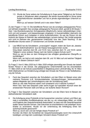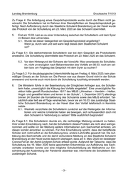 Landtag Brandenburg Drucksache 7/1513 1.5. Wurde der Syrer seitens der Schulleitung im Zuge seiner Tätigkeit an der Schule jemals in Situationen allein eingesetzt, die keinen Ausnahmefall im Sinne reiner Aufsichtsfunktionen darstellten und hat er jemals eigenständigen Unterricht er- teilt? Wenn ja, auf wessen Geheiß und in wie vielen Fällen? Zu den Fragen 1.1 bis 1.5: Die betreffende Person war als sonstiges pädagogisches Perso- nal befristet eingestellt. Das sonstige pädagogische Personal erteilt, gemäß § 68 Absatz 1 Satz 1 des Brandenburgischen Schulgesetzes (BbgSchulG), keinen selbstständigen Unter- richt und wird gruppen- und klassenbezogen eingesetzt. In Ausnahmefällen übernahm die betreffende Person auch Aufgaben in reiner Aufsichtsfunktion. So war die Person mit der Aufsicht der Klasse im Rahmen des selbstständigen Lernens betraut. Der Vorfall ereignete sich nicht im Rahmen des „gemeinsamen Unterrichts“ bzw. des „Team Teaching“. In der betreffenden Stunde waren 21 Schülerinnen und Schüler anwesend. 2. Laut MBJS hat die Schulleiterin „unverzüglich“ reagiert, indem der Syrer als „deeska- lierende Sofortmaßnahme“ aus der Klasse herausgenommen wurde. Ging dieser zwischen dem 06. und 10.03. bzw. zwischen dem 10. und 18.03. seiner Tätigkeit in einer anderen Klasse nach der Astrid-Lindgren-Schule nach? Wenn ja, wie ist dies vor dem Hintergrund des erfolgten gewaltsamen Übergriffs zu rechtfertigen? Wenn nein, wo hielt er sich zwischen dem 06. und 18. März auf und welcher Tätigkeit ging er in diesem Zeitraum nach? Zu Frage 2: Vom 6. März 2020 bis 9. März 2020 erfolgte planmäßig kein Einsatz der betref- fenden Person in der Schule. Die pädagogische Unterrichtshilfe war bis einschließlich 17. März 2020 an der Schule ausschließlich in Begleitung einer Lehrkraft tätig. Ab 18. März 2020 (Maßnahmen zur Eindämmung) erfolgte kein Einsatz der Person in der Notfallbetreu- ung der Schule. 3. Fand das Gespräch zwischen der Schulleiterin und den Eltern im Beisein einer oder mehrerer Personen (z.B. Schulsozialarbeiter, Schulpsychologen, Vertrauenslehrer, weitere Mitglieder des Lehrerkollegiums oder der Schulleitung) statt? Wenn ja, wie viele Personen waren noch anwesend und in welcher Funktion? Wenn nein, fand das Gespräch unter sechs Augen auf speziellen Wunsch einer der anwesenden Personen statt und falls ja, wer äußerte diesen Wunsch? Zu Frage 3: Das Gespräch zwischen der Schulleiterin und den Eltern fand im Beisein der stellvertretenden Schulleiterin statt. 4. Die Anfertigung eines Protokolls ist bei Aussprachen zwischen Lehrern und Eltern ge- rade in ernsthaften Konfliktsituationen wie der o.g. ein notwendiges Mittel, um Inhalt und Ergebnis des Gesprächsverlaufs festzuhalten, so dass sich die Gesprächspartner später darauf berufen können. Das Dokument ist anschließend in der jeweiligen Schü- lerakte zu archivieren. Wurde vor der Unterredung die Anfertigung eines Ge- sprächsprotokolls gewünscht? Wenn ja, durch wen und wer fertigte dieses Protokoll an? Konnten die Eltern die Korrektheit der Gesprächswiedergabe durch ihre Unterschrift bestätigen und liegt dem zuständigen Schulamt dieses Protokoll vor? -2-