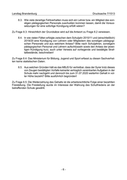 Landtag Brandenburg Drucksache 7/1513 7. Wahlperiode Antwort der Landesregierung auf die Kleine Anfrage Nr. 508 der Abgeordneten Birgit Bessin (AfD-Fraktion) und Dennis Hohloch (AfD-Fraktion) Drucksache 7/1265 Nachfrage zur Antwort der Landesregierung auf die Kleine Anfrage Nr. 385 (Drucksa- che 7/1218) Namens der Landesregierung beantwortet die Ministerin für Bildung, Jugend und Sport die Kleine Anfrage wie folgt: Vorbemerkung der Fragesteller: Aus der Antwort der Landesregierung betreffend den Vorfall an der Astrid-Lindgren-Grundschule in Blankenfelde-Mahlow am 05.03. d.J. sowie aus der Antwort der Ministerin für Bildung, Jugend und Sport auf die Dringlichen Anfragen vom 14.05.2020 (Drucksache 7/1223, 7/1224, 7/1225) ergeben sich weitere Fragen. Wir fragen die Landesregierung: 1. Laut Antwort des MBJS auf Frage 4 der Kleinen Anfrage Nr. 385 wurde die betreffende Person „hauptsächlich zur Unterstützung der Lehrkräfte im gemeinsamen Unterricht eingesetzt“, habe aber „[i]n Ausnahmefällen […] auch Aufgaben in reiner Aufsichts- funktion“ übernommen. Laut nachfolgender Aussage der Ministerin für Bildung, Jugend und Sport soll sich der syrische Staatsbürger zum Zeitpunkt des Vorfalls mit den Schülern allein im Raum aufgehalten haben. 1.1. In welcher konkreten Schulsituation fand die Handgreiflichkeit des Syrers gegen den Schüler der Jahrgangsstufe 6 statt (Fachunterricht, Ganztagsangebot, Pausenaufsicht, Vertretungsaufsicht etc.)? 1.2. Wie viele Kinder hielten sich zum Zeitpunkt des Vorfalls im Raum auf? 1.3. Welche Tätigkeiten fielen in diesem Zusammenhang zum Zeitpunkt des Vorfalls in den Aufgabenbereich des Syrers? 1.4. Ereignete sich der Vorfall im Rahmen des „gemeinsamen Unterrichts“ bzw. des „Team Teaching“? Wenn ja: Wo war der verantwortliche Lehrer, weshalb hielt er sich nicht ebenfalls im Raum auf und stellt dessen Abwesenheit nicht eine grobe Verletzung seiner Fürsorge- und Aufsichtspflicht dar? Wenn nein und falls es sich bei der Tätigkeit des Syrers um eine „reine Aufsichts- funktion“ gehandelt haben sollte: Worin bestand konkret der Ausnahmefall, der es dem Syrer erlaubte, sich allein mit den Schülern im Raum aufzuhalten? Eingegangen: 12.06.2020 / Ausgegeben: 17.06.2020