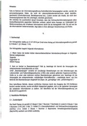 2.2. Entscheidungsgründe Die Information wird gemäß § 4 Absatz 1 Satz 1 VIG antragsgemäß erteilt. Die E-Mail vom 31 .07.2019 stellt einen Antrag gemäß § 4 Absatz 1 Satz 1 VIG dar. Der Antrag ist hinreichend bestimmt. Es ist ein Antrag auf Informationsgewährung gemäß§ 4 Absatz 1, § 2 Absatz 1 VIG bezüglich den letzten beiden lebensmittelrechtlichen Betriebsüberprüfungen sowie auf Herausgabe der entsprechenden Kontrollberichte im Falle von Beanstandungen für den Betrieb Segendo, Eggendobl 18, Passau. Im vorliegenden Verfahren waren Belange Dritter von dem Antrag auf Informationsgewährung betroffen. Deshalb wurde dem betroffenen Dritten gemäß § 5 Absatz 1 Satz 1, 2 VIG Gelegenheit gegeben, sich zur geplanten Informationsherausgabe zu äußern. Der Betrieb stimmte der Informationsgewährung zu. Ausschluss- oder Beschränkungsgründe greifen im vorliegenden Fall nicht. Der betroffene Lebensmittelunternehmer erhält eine Ausfertigung dieses Bescheides und kann gegen diesen Bescheid Klage erheben. 2.3 Ausführungen zur Ziffer 1.3 Gemäß § 5 Absatz 4 VIG haben Widerspruch und Anfechtungsklage in den in § 2 Absatz 1 Satz 1 Nummer 1 genannten Fällen keine aufschiebende Wirkung. Der Informationszugang darf erst er- folgen, wenn die Entscheidung dem oder der Dritten bekannt gegeben worden ist und diesem ein ausreichender Zeitraum zur Einlegung von Rechtsbehelfen eingeräumt worden ist. Der Zeitraum soll 14 Tage nicht überschreiten. 2.4 Ausführungen zur Ziffer 1.4 (Kostenentscheidung): Dieser Bescheid und die Informationsgewährung ergehen gemäß § 7 Absatz 1 Satz 2 VIG kosten- frei, der Verwaltungsaufwand lag unter 1.000 Euro. Rechtsbehelfsbelehrung Gegen diesen Bescheid kann innerhalb eines Monats nach seiner Bekanntgabe Klage erhoben werden bei dem Bayerischen Verwaltungsgericht in Regensburg, Haidplatz 1, 93047 Regensburg. Auf die Möglichkeit der Einlegung eines Rechtsbehelfes durch von der Entscheidung betroffene Drifte, insbesondere auf§ 80 a VwGD, wird hingewiesen. Dafür stehen folgende Möglichkeiten zur Verfügung: a) Schriftlich an oder zur Niederschrift bei dem Bayerischen Verwaltungsgericht in Regensburg, Haidplatz 1, 93047 Regensburg b) Elektronisch nach Maßgabe der Bedingungen, die der Internetpräsenz der Verwaltungsgerichtsbarkeit www.vgh.bayern.de zu entnehmen sind. Hinweis: Die Klageerhebung per einfacher E-Mail ist nicht zugelassen und entfaltet keine rechtlichen Wirkungen!