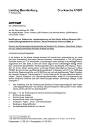 Landtag Brandenburg Drucksache 7/3087 7. Wahlperiode Antwort der Landesregierung auf die Kleine Anfrage Nr. 1041 der Abgeordneten Dennis Hohloch (AfD-Fraktion) und Andreas Kalbitz (AfD-Fraktion) Drucksache 7/2862 Nachfrage zur Antwort der Landesregierung auf die Kleine Anfrage Nummer 926 – Unterstützungsnetzwerk des Vereins „Neues Potsdamer Toleranzedikt e.V.“ Namens der Landesregierung beantwortet die Ministerin für Soziales, Gesundheit, Integra- tion und Verbraucherschutz die Kleine Anfrage wie folgt: Vorbemerkung der Fragesteller: In der Antwort auf die Kleine Anfrage Nummer 926 räumte die Landesregierung ein, dass das Land Brandenburg den Verein „Neues Potsdamer Toleranzedikt e.V.“ seit 2015 jährlich finanziell unterstütze. Die finanziellen Zuwendungen waren Beträge in fünfstelliger Höhe, abgesehen vom Jahr 2016, in dem der Verein sogar einen sechsstelligen Betrag erhielt. Den Löwenanteil der jährlichen Förderungsmittel nahm das Projekt „Interreligiöser Kalen- der“ ein. In den letzten sechs Jahren wurde das Projekt „Interreligiöser Kalender“ mit fast 120.000 Euro durch das Land Brandenburg gefördert. Im Zeitraum von 2015 bis 2020 stieg die jährliche Zuwendungshöhe von 12.000 Euro auf mehr als das Doppelte. Nach Angaben 1 des „Neues Potsdamer Toleranzedikt e.V.“ sei der Kalender für Schulen, öffentliche Einrich- tungen, Vereine, Religions- und Glaubensgemeinschaften sowie für Privatpersonen be- stimmt und könne kostenlos über den Verein bezogen werden. Die Auflage betrage 10.000 Exemplare. 2 1. Wie rechtfertigt sich die Erhöhung des jährlichen Förderungsbetrages für das Projekt „Interreligiöser Kalender“ des Vereins „Neues Potsdamer Toleranzedikt“ in den letzten sechs Jahren auf mehr als das Doppelte? Zu Frage 1: Für die Erhöhung sind mehrere Gründe ausschlaggebend: Erhöhung der Auflage Erhöhung der Seitenzahl Professionelle Texte und Fotografien Gestiegene Papier-, Druck- und Versandkosten Gestiegene Copyrightkosten Verfügbarkeit aller Kalender im Internet 1 Vgl. Drucksache 7/2754 S. 2 f. 2 Vgl. https://www.potsdamer-toleranzedikt.de/irk/, zuletzt aufgerufen am 11.01.2021 um 14:36 Uhr. Eingegangen: 22.02.2021 / Ausgegeben: 01.03.2021