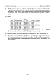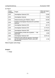 Landtag Brandenburg Drucksache 7/3087 2. Welchen Anteil in absoluten und relativen Zahlen, bezogen auf die Gesamtkosten des Projektes „Interreligiöser Kalender“, nehmen die Förderungsbeträge des Landes Bran- denburg ein? (Bitte jährlich ab 2015 aufschlüsseln. Sofern dies der Landesregierung bekannt sein sollte, bitte auch die Anteile der anderen Zuwendungsgeber aufschlüs- seln.) Zu Frage 2: Anteil Jahr Gesamtkosten Anteil in Prozent Land BB 2015 19.023,91 € 12.000,00 € 63% 2016 19.848,42 € 13.000,00 € 65% 2017 26.122,04 € 20.715,00 € 79% 2018 28.472,16 € 21.170,70 € 74% 2019 33.553,54 € 24.063,23 € 72% 2020 36.251,23 € 25.751,23 € 71% 3. Welche Einnahmen hatte der Verein seit 2015? (Bitte jährlich ausweisen.) Zu Frage 3: Zu diesem Sachverhalt liegen der Landesregierung keine Informationen vor. 4. Wie setzen sich anhand der von den Zuwendungsempfängern eingereichten Verwen- dungsnachweise die konkreten Mittelverwendungen für die nachfolgend aufgelisteten zehn Projekte zusammen? (Bitte die einzelnen Ausgabeposten für das jeweilige Pro- jekt ausweisen.) -2-