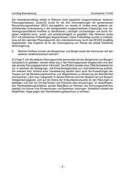 Landtag Brandenburg Drucksache 7/3162 Die Variantenermittlung erfolgt im Rahmen eines gesetzlich vorgeschriebenen iterativen Planungsprozesses. Zunächst wurde für die drei Ortsumgehungen ein gemeinsames Raumordnungsverfahren (ROV) durchgeführt, um bereits im Vorfeld einer späteren ab- schließenden Entscheidung in den fachgesetzlich vorgeschriebenen Zulassungs- bzw. Ge- nehmigungsverfahren Konflikte zu identifizieren, Lösungen vorzuschlagen und durch Vor- gaben möglichst raum-, sozial- und umweltverträglich zu gestalten. Das Verfahren wurde 2011 mit zahlreichen Prüfaufträgen abgeschlossen. Diese Prüfaufträge wurden in Vorberei- tung auf den nächsten Planungsschritt, die Linienbestimmung, durch die DEGES sorgfältig abgearbeitet. Das Ergebnis ist für die Ortsumgehung von Plessa die aktuell diskutierte Nordumgehung. 5. Welchen Einfluss können die Bürgerinnen und Bürger sowie die Kommunen auf den weiteren Verfahrensverlauf nehmen? Zu Frage 5: Um die weiteren Planungsschritte gemeinsam mit den Bürgerinnen und Bürgern transparent zu gestalten, werden diese eng in den Planungsprozess eingebunden und über das aktuelle Planungsgeschehen informiert. Die DEGES bereitet einen Öffentlichkeitstermin vor, in welchem der Abwägungs- und Entwicklungsprozess zur Linienbestimmung ausführ- lich erläutert wird. Anhand einer Visualisierung werden dann auch die Auswirkungen der Trassen auf die Bevölkerung/Anwohner und Möglichkeiten zu Minderung der Betroffenheit (Immissionen, Lärm usw.) dargestellt. In diesem Rahmen wird den Bürgerinnen und Bürgern Gelegenheit gegeben, sich auf der Ebene der Entwurfsplanung aktiv an den Planungen zu beteiligen und ihre Vor-Ort-Kenntnisse und Wünsche aktiv einzubringen. Im darauffolgen- den Planfeststellungsverfahren werden Betroffene im Rahmen des Anhörungsverfahrens beteiligt und können ihre Einwendungen und Bedenken vorbringen. Schließlich besteht die Möglichkeit, Klage gegen den Planfeststellungsbeschluss zu erheben. -2-