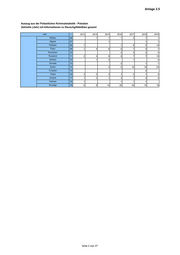 Anlage 2.5 Auszug aus der Polizeilichen Kriminalstatistik - Potsdam Zeitreihe (Jahr) mit Informationen zu Rauschgiftdelikten gesamt Jahr 1 2013 2014 2015 2016 2017 2018 2019 Erfasste Fälle 2 340 533 590 561 816 1.011 1.090 Aufgeklärte Fälle 3 306 495 558 521 771 937 1.029 Aufklärungsquote in % 4 90,0 92,9 94,6 92,9 94,5 92,7 94,4 Tatverdächtige gesamt 11 297 440 488 491 687 816 850 männlich 12 254 363 396 428 586 689 699 weiblich (TV) 13 43 77 92 63 101 127 151 Altersdurchschnitt 14 23,4 24,6 23,9 25,7 24,9 23,9 23,0 8 Jahre und älter 17 297 440 488 491 687 816 850 6 bis unter 14 Jahre 18 5 12 12 11 7 16 12 absolut 19 5 12 12 11 7 16 12 0 bis unter 14 Jahre Anteil an TVges 20 1,7 2,7 2,5 2,2 1,0 2,0 1,4 in % absolut 21 66 97 111 89 157 228 228 14 bis unter 18 Jahre Anteil an TVges 22 22,2 22,0 22,7 18,1 22,9 27,9 26,8 in % absolut 23 43 59 69 64 125 146 179 18 bis unter 21 Jahre Anteil an TVges 24 14,5 13,4 14,1 13,0 18,2 17,9 21,1 in % 14 bis unter 21 Jahre 25 109 156 180 153 282 374 407 absolut 26 114 168 192 164 289 390 419 0 bis unter 21 Jahre Anteil an TVges 27 38,4 38,2 39,3 33,4 42,1 47,8 49,3 in % TV-Alter absolut 28 183 272 296 327 398 426 431 21 Jahre und älter Anteil an TVges 29 61,6 61,8 60,7 66,6 57,9 52,2 50,7 in % 21 bis unter 25 Jahre 30 70 67 68 71 89 105 132 25 bis unter 30 Jahre 31 56 77 110 99 120 106 105 30 bis unter 40 Jahre 32 51 104 102 132 147 175 153 40 bis unter 50 Jahre 33 4 22 13 22 29 34 32 50 bis unter 60 Jahre 34 1 2 2 3 12 6 6 21 bis unter 60 Jahre 35 182 272 295 327 397 426 428 absolut 36 1 1 1 3 60 Jahre und älter Anteil an TVges 37 0,3 0,0 0,2 0,0 0,1 0,0 0,4 in % 60 bis unter 70 Jahre 38 1 1 1 1 70 Jahre und älter 39 2 70 bis unter 80 Jahre 40 2 Nichtdeutsche gesamt 42 23 31 43 63 96 91 106 Anteil an TV ges in % 43 7,7 7,0 8,8 12,8 14,0 11,2 12,5 männlich 44 22 24 42 58 91 84 96 weiblich 45 1 7 1 5 5 7 10 Afghanistan 46 1 5 12 12 Ausgew. Staatsangehörigkeiten der TV Tatverdächtige Albanien 48 1 1 1 Algerien 49 1 Bosnien-Herzegowina 51 1 2 2 3 5 3 1 Bulgarien 52 1 1 2 2 3 1 1 Elfenbeinküste Cote d'Ivoire 53 1 (TV) Eritrea 54 1 Ghana 56 2 1 Irak 57 1 Iran 58 1 1 1 7 4 3 Kamerun 59 2 1 1 Kosovo 60 1 Lettland 61 1 2 1 Libanon 62 2 1 Libyen 63 1 Litauen 64 2 1 3 3 1 Marokko 65 2 1 Seite 1 von 27