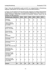 Landtag Brandenburg Drucksache 7/1723 Frage 2: Wie viele Gewaltdelikte wurden seit 2013 von Linksextremisten in Brandenburg begangen? (Bitte jährlich und nach Delikten im Sinne des StGB ausweisen.) zu Frage 2: Für den Zeitraum 2013 bis 2019 wurden insgesamt 212 politisch linksmotivierte Gewaltstraftaten im Rahmen des „Kriminalpolizeilichen Meldedienst in Fällen Politisch mo- tivierter Kriminalität“ (KPMD-PMK) vermeldet und klassifiziert. Deliktisch setzten sich die Straftaten wie folgt zusammen: Straftaten gem. StGB 2019 2018 2017 2016 2015 2014 2013 Widerstand (§ 113 StGB) 6 1 5 15 10 3 3 Tätlicher Angriff auf Vollstreckungsbeamte 1 0 0 0 0 0 0 (§ 114 StGB) Landfriedensbruch (§§ 125, 125a StGB) 1 0 0 9 10 5 1 Körperverletzung (§§ 223, 224 StGB ) 8 14 11 20 23 18 9 Raub (§ 249 StGB) 0 2 0 0 0 1 0 Räuberischer Diebstahl (§ 252 StGB) 1 0 0 0 0 0 0 Räuberische Erpressung (§ 255 StGB) 0 0 0 0 0 0 1 Brandstiftung (§§ 306, 306a, 306b StGB) 2 1 2 3 1 1 0 Herbeiführen einer Sprengstoffexplosion 1 0 0 0 0 0 0 (§ 308 StGB) Gefährliche Eingriffe in den Bahn‐, Schiffs‐ und Luftverkehr 4 0 3 2 2 1 0 (§ 315 StGB) Gefährliche Eingriffe in den Straßenverkehr 0 0 3 4 2 1 1 (§ 315b StGB) Gesamt 24 18 24 53 48 30 15 -2-