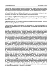 Landtag Brandenburg Drucksache 7/1723 Frage 3: Gab es in Brandenburg bereits Ermittlungs- oder Strafverfahren, die im Zusam- menhang mit Linksterrorismus in Verbindung standen? (Wenn ja, dann bitte den jeweiligen Tatort, Tatzeitpunkt, das vorgeworfene Tatgeschehen und den Verfahrensstand mitteilen.) zu Frage 3: Für den Zeitraum 2013 bis 2019 wurden keine terroristischen Straftaten im Rah- men des KPMD-PMK für den Phänomenbereich PMK -links- vermeldet. Frage 4: Gibt es nach Erkenntnissen des brandenburgischen Verfassungsschutzes in Bran- denburg gleichfalls Tendenzen, die auf linksterroristische Bestrebungen hindeuten? (Wenn ja, wo und in welcher Form?) zu Frage 4: Sollten im Land Brandenburg entsprechende Bestrebungen bestehen, wird hier- über den zuständigen Gremien berichtet. Frage 5: Welches Gefahrenpotential sieht die Landesregierung für die Bevölkerung im All- gemeinen und im Besonderen für von Linksextremisten ausgemachte „politische Gegner“ in Brandenburg? zu Frage 5: Linksextremistische Gewaltstraftaten im Land Brandenburg richten sich fast ausschließlich gegen vermeintliche politische Gegner oder gegen Polizeibeamte. Mit sol- chen ist auch zukünftig zu rechnen. Das durch linksextremistisch motivierte Straftaten ver- ursachte Gefahrenpotential für die übrige Bevölkerung wird als eher gering bewertet. Linksextremistische Gruppierungen bekämpfen auf verschiedenem Wege das politische Sy- stem. Kommunistische und anarchistische Gruppierungen setzen sich dabei gleichermaßen für einen revolutionären Bruch mit den Eigentums- und demokratischen Machtverhältnissen ein. Kommunistische Gruppierungen zielen hierfür zunächst auf die Errichtung einer „Dikta- tur des Proletariats“ unter der uneingeschränkten Führungsrolle einer kommunistischen Partei ab. Die Bemühungen der in Brandenburg tätigen „Deutschen Kommunistischen Par- tei (DKP)“ und Einzelpersonen der „Marxistisch-Leninistischen Partei Deutschlands (MLPD) erzielen dabei allerdings nur eine sehr begrenzte Reichweite. Das Aktionsfeld „Antifaschis- mus“ stellt für die autonomen Szenen in Brandenburg traditionell den größten Mobilisie- rungsfaktor dar und schafft Allianzen unter den regionalen Gruppen. Im Mittelpunkt steht die Konfrontation mit dem politischen Gegner. Das gilt insbesondere im Rahmen von Veranstal- tungs- und Demonstrationsgeschehen. Sofern sich dabei entsprechende Möglichkeiten bie- ten, kommt es zu Konfrontationsdelikten mit dem „rechten“ Spektrum und zu Angriffen auf die Polizei. Derartige Tatgelegenheiten werden seitens der linksextremistischen Szene ge- zielt gesucht und provoziert. Gewalt gegen den politischen Gegner wird als vermeintlich legitimes Mittel der Auseinandersetzung genutzt. Die aggressive Stimmung autonomer Gruppen richtet sich aber nicht nur gegen selbstdefinierte „Rechte“. Im Rahmen des Akti- onsfeldes „Antirepression“ agiert die Szene gegen die Polizei, andere staatliche Organe, Behörden und einzelne Abgeordnete des Landtages. Ihnen wird vorgeworfen „Faschisten“ zu schützen, linkes Engagement zu unterbinden, die eigenen Kompetenzen illegitimer Weise auszubauen und somit einen Überwachungsstaat zu schaffen. Trotz eines Anstiegs der politisch linksmotivierten Kriminalität und einer Steigerung linksmotivierter Gewaltstraf- taten in Brandenburg im Wahljahr 2019 im Vergleich zu 2018 ist der bundesweite Trend hin zur Bildung klandestiner militanter Kleingruppen, die schwerste Straftaten begehen, für brandenburgische Linksextremisten bislang nicht festzustellen. Des Weiteren wird auf den Verfassungsschutzbericht 2018 ab Seite 132 verwiesen. -3-