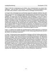 Landtag Brandenburg Drucksache 7/1723 Frage 6: Sieht die Landesregierung die Gefahr, dass Linksextremisten aus anderen Bun- desländern - etwa aus Berlin oder Sachsen - Gewalttaten in Brandenburg begehen könn- ten? (Bitte näher ausführen, welche Erkenntnisse zur jeweiligen Annahme führen.) zu Frage 6: Die Landesregierung ist aufmerksam gegenüber jedweden Gefahren des politi- schen Extremismus, der Schwerpunkt liegt für Brandenburg im Rechtsextremismus mit allen Ausprägungen, d. h. vom parteigebundenen Rechtsextremismus bis hin zu massiven Ge- walttaten. Es besteht aber auch die Möglichkeit, dass Gewalttaten im Sinne der Frage in Brandenburg verübt werden. Als Täter linksextremistischer Gewalttaten wurden in den ver- gangenen Jahren zu einem hohen Anteil Personen mit Wohnsitz im Land Brandenburg er- mittelt. In Einzelfällen wurden Tatverdächtige aus anderen Bundesländern festgestellt oder ermittelt. Dies ist auch künftig zu erwarten bzw. nicht auszuschließen. Gefahren gehen hier insbesondere deshalb aus, weil Gewalt gegen den politischen Gegner im autonomen Milieu als ein legitimes Mittel der Auseinandersetzung angesehen wird. Allerdings ist es 2019 auf Demonstrationen der o. g. Akteure zu keinen nennenswerten polizeilichen Vorkommnissen gekommen. Es besteht zudem ein abstraktes Risiko, dass Akteure aus anderen Bundeslän- dern auch gegen kritische Infrastruktur in Brandenburg agieren könnten. Frage 7: In welcher Form arbeitet der brandenburgische Verfassungsschutz zur Verhütung entsprechender linksterroristischer Straftaten mit den Verfassungsschutzbehörden des Bun- des, Berlins und Sachsens zusammen? zu Frage 7: Entsprechend seines gesetzlichen Auftrages prüft die Verfassungsschutzbe- hörde des Landes Brandenburg fortlaufend, ob Anhaltspunkte für einen dahingehenden Verdacht vorliegen, dass linksextremistische Bestrebungen/Straftaten die freiheitliche demokratische Grundordnung zu beseitigen oder außer Kraft zu setzen versuchen. So- weit die Aktivitäten über das Gebiet des Landes Brandenburg hinausgehen, werden die in anderen Bundesländern anfallenden Informationen hierbei einbezogen und die Be- wertung gemeinsam mit den anderen Verfassungsschutzbehörden der Länder und dem Bundesamt vorgenommen. Zudem bestehen entsprechende gemeinsame Zentren [Das „Gemeinsame Terrorismusabwehrzentrum (GTAZ)“ und das „Gemeinsame Extremis- mus- und Terrorismusabwehrzentrum (GETZ)“]. Die Bearbeitung extremistischer Bestre- bungen sowie Straftaten erfolgt im Rahmen eines vorgesehenen Informationsaustausches zwischen den Verfassungsschutzbehörden und dem polizeilichen Staatsschutz. -4-
