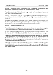 Landtag Brandenburg Drucksache 7/1824 zu Frage 1: Im Zeitraum vom 22. Dezember 2018 bis 31. Dezember 2019 wurden im Land Brandenburg 17 Anträge auf Änderung des Geschlechtseintrags gestellt. Frage 2: In wie vielen der Fälle im Sinne der Frage 1 wurde der Antrag abgelehnt bzw. wurde noch keine Entscheidung getroffen? zu Frage 2: In einem Fall wurde der Antrag auf Änderung des Geschlechtseintrags abge- lehnt. In diesem Verfahren hat die betroffene Person Klage erhoben, die derzeit noch an- hängig ist. Frage 3: In wie vielen Fällen im Sinne der Frage 1 erfolgte die ärztliche Bescheinigung bzw. die Änderung der Geschlechtsangabe nicht aufgrund biologisch-körperlicher Merkmale, sondern aufgrund von psychologischem Geschlechtsidentitätsempfinden? zu Frage 3: Dies erfolgte in keinem Fall. Frage 4: Bei wie vielen Neugeborenen wurde seit Inkrafttreten der neuen Bestimmung des PStG im Land Brandenburg die Geschlechtszugehörigkeit mit „divers“ eingetragen? zu Frage 4: Bei keinem Neugeborenen im Land Brandenburg wurde im Zeitraum vom 22. Dezember 2018 bis 31. Dezember 2019 die Geschlechtsangabe „divers“ eingetragen. Frage 5: Wie viele Bewerbungen gingen bei den verschiedenen Behörden und Stellen des Landes Brandenburg auf ausgeschriebene Stellen ein, seit bei den Stellenangeboten die Geschlechteroption „m/w/d“ vermerkt wird, in wie vielen dieser eingegangenen Bewerbun- gen lautete die Geschlechterangabe der sich bewerbenden Person „divers“ und wie viel Prozent aller Bewerbungen entsprach dies? zu Frage 5: Angaben zu der Gesamtzahl der Bewerbungen auf Stellenausschreibungen des Landes Brandenburg mit dem Vermerk „m/w/d“ liegen der Landesregierung nicht vor. Ebenso liegen keine Angaben darüber vor, bei wie vielen Bewerbungen die Geschlechtsan- gabe „divers“ lautete. -2-