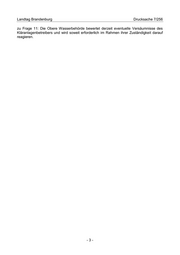 Landtag Brandenburg Drucksache 7/256 zu Frage 11: Die Obere Wasserbehörde bewertet derzeit eventuelle Versäumnisse des Kläranlagenbetreibers und wird soweit erforderlich im Rahmen ihrer Zuständigkeit darauf reagieren. -3-