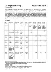 Landtag Brandenburg Drucksache 7/2726 7. Wahlperiode Frage 2: Welche konkreten Programme und Maßnahmen zur Integration von Langzeitar- beitslosen in den Arbeitsmarkt hat die Landesregierung mit welchen finanziellen Mitteln seit 2010 gefördert? (Bitte differenziert nach Programm/Maßnahme, Förderzeitraum, Art der Förderung, nach Höhe der jeweiligen Förderung, nach Höhe der dadurch in den Arbeits- markt integrierten Personen nach Anforderungsniveau Helfer, Fachkraft, Spezialist, Experte, nach sozialversicherungspflichtig Beschäftigte, nach ausschließlich geringfügig entlohnte Beschäftigte, nach Staatsangehörigkeit Deutsch, Ausländer, EU-Ausländer, Staatsangehö- rigkeit aus einem Top-8-Asylherkunftsland einzeln ausweisen.) zu Frage 2: ESF- Programm Förderzeit- Art der Förder- Förder- Anzahl Anzahl Anzahl Förder- raum Förde- volumen volumen Vermitt- Vermitt- Vermitt- periode rung ESF Landes- lungen lungen lungen mittel sv-pfl.Be- in Be- in sonst. schäfti- rufsaus- Erwerbs- gung bildung tätigkeit1 - Arbeit für 01.07.2010- Projekt- - 11 Mio. - 2.112 Brandenburg 31.12.2014 förde- Euro rung 2007- Regional- 01.03.2010- Projekt- 40 Mio. 2.086 455 8942 2013 budget IV 29.02.2012 förde- Euro rung 2007- Regional- 01.03.2012- Projekt- 50 Mio. 2.512 711 1.1353 2013 budget V 28.02.2014 förde- Euro rung 2007- Perspektive 01.03.2014- Projekt- 13 Mio. 616 192 - 2013 Arbeit – Re- 31.03.2015 förde- Euro gionale Pro- rung jekte für Ar- beitslose 2007- Förderung 01.12.2012- Projekt- 22 Mio. 2.4464 98 279 2013 der Inte-grati- 31.03.2015 förde- Euro onsbeglei- rung tung von Langzeitar- beitslosen 1 Geförderte Arbeitsverhältnisse gem. § 88 SGB III (EGZ), 16e SGB II, öff. gef. Beschäftigung AGH-MAE nach § 16d SGB II , geringfügige Beschäftigung, Selbständigkeit 2 davon 327 Minijob 3 davon 587 Minijob 4 davon 1.226 Vermittlungen in nachhaltige sv-pflichtige Beschäftigung Eingegangen: 17.12.2020 / Ausgegeben: 22.12.2020