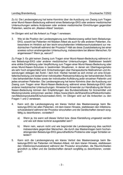 Landtag Brandenburg Drucksache 7/2502 Die Landesregierung hat keine Kenntnis über gesundheitliche Probleme oder Schäden, die durch das Tragen einer Mund-Nasen-Bedeckung während eines Belastungs-EKG oder an- derer medizinischer Untersuchungen entstanden sind. Jede Ärztin und jeder Arzt entschei- det im Einzelfall unter Abwägung eventuell bestehender gesundheitlicher Risiken darüber, ob während medizinischer Untersuchungen durch die Patientin oder den Patienten eine Mund-Nasen-Bedeckung zu tragen ist. Ärztliche Berufs- und Fachverbände, die Ärztekam- mern und andere Institutionen informieren und sensibilisieren die Ärztinnen und Ärzte fort- laufend und aktuell u.a. zu Themen der Infektionsprohpylaxe, zu der auch das Tragen einer Mund-Nasen-Bedeckung gehört. Auch die Brandenburger Landesregierung informiert dazu auf vielfältige Weise. Entsprechende Abfragen bei allen im Land Brandenburg bestehenden medizinischen Einrichtungen und bei den dort Tätigen werden von der Landesregierung aus den genannten Gründen als nicht notwendig betrachtet. 10. Gibt es Erkenntnisse über Leistungsabfall durch das Tragen von Masken beim Be- lastungs-EKG und damit zusammenhängender Nicht-Verwertbarkeit bzw. Einschrän- kung der Verwertbarkeit der Ergebnisse? a) Wenn ja, wie lauten die konkreten medizinischen Erkenntnisse? Wie viel Prozent der Untersuchungen sind durch das Tragen von Masken nicht aussagekräftig und bei wie viel Prozent der Untersuchungen ist durch das Tragen von Masken die Aussagekraft der Ergebnisse eingeschränkt? b) Wenn nein, beabsichtigt die Landesregierung, zur Einschätzung der Notwendig- keit diesbezüglicher Anweisungen oder Regelungen für die Mediziner, hierüber z.B. mit Experten ins Gespräch zu kommen oder anderweitig für Erkenntnisge- winn zu sorgen? Wenn nein, warum nicht? Zu Frage 10: Die Landesregierung hat keine eigenen Kenntnisse über Leistungsabfälle, die durch das Tragen einer Mund-Nasen-Bedeckung während eines Belastungs-EKG oder an- derer medizinischer Untersuchungen verursacht werden. In diesem Zusammenhang wird auf die Antworten zu den Fragen 8 und 9 verwiesen. 11. Ist die Landesregierung bezüglich des Themas dieser Kleinen Anfrage in Kontakt mit… a) der Landesärztekammer? b) der Bundesärztekammer? c) der Kassenärztlichen Vereinigung Brandenburg? Wenn ja, was sind die Positionen dieser einzelnen Organisationen zum Thema dieser Kleinen Anfrage? Wenn nein, warum nicht? Zu Frage 11: Die Landesregierung ist im Zusammenhang mit der Planung und Durchführung der zur Bewältigung der COVID-19-Pandemie notwendigen Maßnahmen auch mit ärztlichen Standesorganisationen und der Kassenärztlichen Vereinigung Brandenburg in einem konti- nuierlichen Austausch auf verschiedenen Ebenen. Die Landesregierung spricht jedoch nicht für die in Frage 11 benannten Institutionen. Deren Positionen können durch die Fragesteller jeweils direkt bei diesen Institutionen erfragt werden. -6-