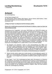 Landtag Brandenburg Drucksache 7/215 7. Wahlperiode Antwort der Landesregierung auf die Kleine Anfrage Nr. 50 der Abgeordneten Sabine Barthel (AfD-Fraktion), Dennis Hohloch (AfD-Fraktion), Volker Nothing (AfD-Fraktion) und Lars Schieske (AfD-Fraktion) Drucksache 7/68 „Fridays for Future“ am Nauener Da-Vinci-Campus (LDVC) Namens der Landesregierung beantwortet die Ministerin für Bildung, Jugend und Sport die Kleine Anfrage wie folgt: Vorbemerkung der Fragesteller: Laut einem MOZ-Artikel vom 28.09.2019 erklärte der Schulleiter des Gymnasiums auf dem Nauener Leonardo-Da-Vinci-Campus, die „Fridays for Future“-Demonstration stießen bei den Schülern, von denen ca. 1/3 regelmäßig an den Klima-Demonstrationen teilnähmen, weiterhin auf „ungebrochene Resonanz“. Die Schule wolle daher ihrer „moralischen Verpflichtung“ nachkommen, weswegen die Demonstrati- onsteilnahme legalisiert werden solle. Im Artikel kommen Schüler zu Wort, die eindeutig den politischen Charakter der Klima-Demonstrationen zum Ausdruck bringen. Fachlich seien die Demonstrationen eingebettet in von Schülern entwickelten Projekten, demnach Teil des Unterrichts und würden entsprechend in die Benotung einfließen. Unterfüttert würden die Veranstaltungen durch „wissenschaftliche Einblicke“, durchgeführt u.a. vom Science-for-Future-Mitglied Prof. Dr. Dieter Neher von der Universität Potsdam. 1. Die Ministerin hat wiederholt, zuletzt in einer Pressemitteilung des MBJS vom 19.09.2019, darauf hingewiesen, dass die Schulpflicht nicht außer Kraft gesetzt wer- den dürfe. Gleichzeitig überlässt sie es den Schulleitungen, mit der Situation „eigen- verantwortlich“ und „angemessen“ umzugehen. Fällt die Ankündigung des o.g. Schul- leiters, die Demonstrationsteilnahme offiziell sanktionieren zu wollen, für die Ministerin unter „angemessene Reaktion“ der Schulen zur Aufrechterhaltung der Schulpflicht? 2. Welche Schritte werden seitens des Landes jenseits von Ankündigungen gesetzt, um gegen die voranschreitende Aufweichung und eigenmächtig großzügige Auslegung der in §§ 41 und 44 BbgSchulG verankerten Schulpflicht seitens einiger Schulen vor- zugehen? Zu den Fragen 1 und 2: Der Landesregierung liegen keine Informationen zur Teilnahme von Schülerinnen und Schülern des Leonardo-Da-Vinci-Campus an Demonstrationen vor. Die vorliegenden Rückmeldungen der Schulen zeigen, dass die Schulen verantwortungs- voll mit der Umsetzung der Schulpflicht im Zusammenhang mit der Teilnahme von Schüle- rinnen und Schülern an den Klimademonstrationen umgehen. Daher sind keine weiteren Schritte der Landesregierung notwendig. Eingegangen: 20.11.2019 / Ausgegeben: 26.11.2019