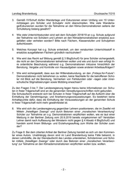 Landtag Brandenburg Drucksache 7/215 13. Gemäß §4 Absatz1 BbgSchulG trägt die Schule zur Verwirklichung der Werteordnung des Grundgesetzes und der Verfassung des Landes Brandenburg bei. Wie trägt die Landesregierung diesem Auftrag Rechnung, wenn auf den „Fridays for Future“- Demonstrationen auch Zeichen von extremistischen Organisationen gezeigt werden und auch sogenannte „antifaschistische“ sozialistische Gruppierungen teilnehmen, wie erst kürzlich durch den hamburgischen Verfassungsschutz kritisiert worden und in Ber- lin durch diverse Zeitungsartikel und Bild- wie Filmmaterial belegbar ist? Zu Frage 13: Nach Auffassung der Landesregierung handelt es sich bei den „Fridays for Future“-Demonstrationen nicht um schulische Veranstaltungen. Der Landesregierung liegen keine Erkenntnisse vor, dass auf Demonstrationen im Land Brandenburg, an denen auch Schülerinnen und Schüler des Landes Brandenburg teilge- nommen haben, Zeichen oder Symbole extremistischer Organisationen gezeigt bzw. ver- wendet wurden. 14. Wie sollen sich Eltern unter solchen, in Frage 13 beschriebenen, Umständen noch auf den moralischen wie politischen Schutzauftrag der Schule verlassen können? Zu Frage 14: Die Schulen im Land Brandenburg sind an die Grundsätze und Ziele der Er- ziehung und Bildung gemäß Artikel 28 der Landesverfassung sowie an § 4 Absatz 4 BbgSchulG gebunden und haben aus diesen Grundsätzen politische und weltanschauli- che Neutralität zu gewährleisten. Die Landesregierung hat keinen konkreten Anlass, an der Einhaltung dieser Grundsätze durch die Brandenburger Schulen zu zweifeln. 15. Vertreter der scheidenden Landesregierung, der sie stützenden Fraktionen, der CDU und der Grünen spendeten in den vergangenen Monaten reichlich Lob für die Teil- nahme der Schüler an den „Fridays for Future“-Demonstrationen. Welche sonstigen aktuellen politischen Themen böten sich nach Auffassung der Landesregierung jen- seits der Klimapolitik für eine außerschulische Vertiefung im Rahmen von Teilnahmen an Demonstrationen und unter ebenso großzügiger Auslegung der Schulpflicht, des Verbots politischer Werbung u.ä. an? Bitte politische Themenblöcke auflisten, nach „Engagement erwünscht“ bzw. „unerwünscht“ aufschlüsseln und nach Möglichkeit ei- nen Wochentag vorschlagen. Zu Frage 15: Ob und an welchen Demonstrationen die Brandenburger Schülerinnen und Schüler außerschulisch teilnehmen, ist eine persönliche Entscheidung der Schülerinnen und Schüler und kann nur durch sie selbst entschieden werden. -4-