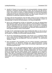 Landtag Brandenburg Drucksache 7/215 9. Gemäß § 47 Absatz 2 ist es ausdrücklich und unmissverständlich untersagt, politische Werbung in schulischen Veranstaltungen zu dulden. Wie will das Land dies durchzu- setzen, wenn „Fridays for Future“, mit dieser Organisation sympathisierende Gruppie- rungen und Schüler von bestimmten politischen Parteien z.B. durch das Präsentieren parteipolitischer Symbole vereinnahmt werden bzw. diese Gruppen ihrerseits zur Un- terstützung von bestimmten politischen Parteien aufrufen? Zu Frage 9: Bei den Demonstrationen unter dem Motto „Fridays for Future“ handelt es sich nach Auffassung der Landesregierung nicht um schulische Veranstaltungen, sondern um Veranstaltungen im Rahmen der Demonstrations- und Versammlungsfreiheit. 10. Hält es die Landesregierung mit Blick auf „Mündigkeit“ als eines der übergeordneten Bildungsziele für legitim, wenn Schüler im Rahmen „wissenschaftlicher Einblicke“ ein- seitig mit bestimmten Meinungen konfrontiert werden und mit welchen Vorschlägen wird die Landesregierung an o.g. Gymnasium in Nauen herantreten, um zukünftig die Prinzipien von Pluralität und Kontroversität bei der Diskussion aktuell bedeutsamer po- litisch-gesellschaftlicher Themen sicherzustellen? Zu Frage 10: Der Landesregierung liegen keine Anhaltspunkte dafür vor, dass an der ge- nannten Schule - entgegen dem eigenen Leitbild und der eigenen Zielsetzung der Schule - die Prinzipien von Pluralität und Kontroversität missachtet werden. 11. Wie will die Landesregierung sicherstellen, dass Schulen und v.a. schulischer Betrieb nicht zu einer gewissen Beliebigkeit degenerieren, wenn tagesaktuelle Themen solch starken Einfluss auf das grundlegendste Prinzip des Unterrichts - die verpflichtende Teilnahme - haben? 12. Wird die Ministerin ihren Schulleitern auch bei anderen thematisch ausgerichteten Demonstrationen von öffentlichem Belangen den „eigenverantwortlichen“ Umgang gewähren und darauf vertrauen, dass in jedem Fall individuell „angemessen“ durch die Schulleitung gehandelt wird? Zu den Fragen 11 und 12: Die Landesregierung begrüßt es, wenn sich Schülerinnen und Schüler politisch und gesellschaftlich engagieren. Neben außerschulischen Orten bietet selbstverständlich auch der Unterricht zahlreiche Möglichkeiten, die Themen Umwelt- schutz und Klimawandel sowie weitere aktuelle Themen aufzugreifen und zu diskutieren. Die Schulen zeigen, dass sie damit verantwortungsvoll umgegangen sind und weiter um- gehen. Daher sieht die Landesregierung keine Notwendigkeit, weitere Maßnahmen herzu- stellen, um die verpflichtende Teilnahme der Schülerinnen und Schüler am Unterricht si- cherzustellen, auch im Zusammenhang mit anderen thematisch ausgerichteten Demonst- rationen. -3-