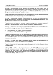 Landtag Brandenburg Drucksache 7/650 7. Wahlperiode Antwort der Landesregierung auf die Kleine Anfrage Nr. 201 der Abgeordneten Andrea Johlige (Fraktion DIE LINKE) Drucksache 7/442 Rechtsextreme Kleinstpartei „Der III. Weg“ Namens der Landesregierung beantwortet der Minister des Innern und für Kommunales die Kleine Anfrage wie folgt: Vorbemerkung der Fragestellerin: Seit Ende 2014 sind in der rechten Szene Brandenburgs zahlreiche Aktivitäten der rechtsextremen Kleinstpartei „Der III. Weg“ zu beobachten. Auf der Website der Gruppierung wird von zahlreichen Flugblatt-Verteil-Aktionen, Wanderungen und Aktionen in Brandenburg aber auch Teilnahme an Aktivitäten der rechten Szene au- ßerhalb Brandenburgs berichtet. Bereits in den vergangenen Jahren hat die Landesregie- rung zu dieser Gruppierung in Drucksache 6/2487, Drucksache 6/5489, Drucksache 6/8349 und 6/10512 Auskunft gegeben. Die folgenden Fragen beziehen sich auf neue Erkenntnisse bzw. Veränderungen seit dieser Antwort der Landesregierung. Frage 1: Welche Informationen hat die Landesregierung über Ziele und politische Positionen dieser Gruppierung? Gab es Veränderungen? zu Frage 1: Der Landesregierung sind keine grundlegenden Veränderungen bekannt. Die Ziele und Positionen der Gruppierung gehen - nach wie vor zutreffend - aus dem Verfas- sungsschutzbericht 2018 (S. 67 ff) hervor. Frage 2: Welche Informationen hat die Landesregierung über die personelle Stärke? Gab es Veränderungen? zu Frage 2: Aktuell werden der Partei „DER DRITTE WEG“ (Der III. Weg) ca. 35 Mitglieder im Land Brandenburg zugerechnet. Frage 3: Welche neuen Erkenntnisse über die Mitglieder und Funktionäre dieser Gruppie- rung liegen vor? Verfügt die Gruppierung über Mandatsträger in Kommunalparlamenten (bspw. durch Übertritt), wenn ja, in welchen? zu Frage 3: Laut einer Übersicht der Vorstandsmitglieder der Partei „Der III. Weg“, vorlie- gend beim Bundeswahlleiter, gehören zwei in Brandenburg wohnhafte Personen dem Vorstand des Gebietsverbandes Mitte an. Davon wird eine Person im Bundesvorstand der Partei geführt. Die Partei verfügt über keine Mandatsträger in brandenburgischen Kommunalparlamenten. Eingegangen: 11.02.2020 / Ausgegeben: 17.02.2020
