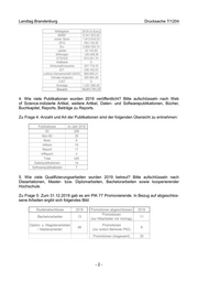 Landtag Brandenburg Drucksache 7/1204 4. Wie viele Publikationen wurden 2019 veröffentlicht? Bitte aufschlüsseln nach Web of Science-indizierte Artikel, weitere Artikel, Daten- und Softwarepublikationen, Bücher, Buchkapitel, Reports, Beiträge zu Reports. Zu Frage 4: Anzahl und Art der Publikationen sind der folgenden Übersicht zu entnehmen: 5. Wie viele Qualifizierungsarbeiten wurden 2019 betreut? Bitte aufschlüsseln nach Dissertationen, Master- bzw. Diplomarbeiten, Bachelorarbeiten sowie kooperierender Hochschule. Zu Frage 5: Zum 31.12.2019 gab es am PIK 77 Promovierende. In Bezug auf abgeschlos- sene Arbeiten ergibt sich folgendes Bild: -2-