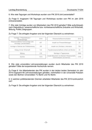Landtag Brandenburg Drucksache 7/1204 6. Wie viele Tagungen und Workshops wurden vom PIK 2019 (mit-)veranstaltet? Zu Frage 6: Insgesamt 136 Tagungen und Workshops wurden vom PIK im Jahr 2019 (mit)veranstaltet. 7. Wie viele Vorträge wurden von Mitarbeitern des PIK 2019 gehalten? Bitte aufschlüsseln nach Zielpublikum: wissenschaftliche bzw. nichtwissenschaftliche (Industrie und Wirtschaft, Bildung, Politik) Zielgruppen. Zu Frage 7: Die erfragten Angaben sind der folgenden Übersicht zu entnehmen: 8. Wie viele universitäre Lehrveranstaltungen wurden durch Mitarbeiter des PIK 2019 gehalten? Bitte die kooperierende Hochschule nennen. Zu Frage 8: Von Mitarbeitenden des PIK wurden in den letzten beiden Semestern im Jahr 2019 insgesamt 69 Lehrveranstaltungen gehalten, mehrheitlich in der Universität Potsdam sowie den Berliner Universitäten TU Berlin und HU Berlin. 9. In welchen politikberatenden Gremien arbeiteten Mitarbeiter des PIK 2019 kontinuierlich mit? Zu Frage 9: Die erfragten Angaben sind der folgenden Übersicht zu entnehmen: -3-