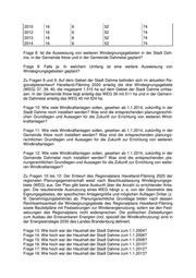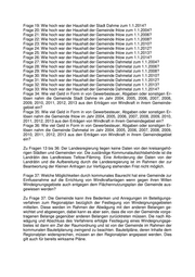 2010 16 6 52 74 2012 16 6 52 74 2013 16 6 52 74 2014 16 6 52 74 Frage 8: Ist die Ausweisung von weiteren Windeignungsgebieten in der Stadt Dah- me, in der Gemeinde Ihlow und in der Gemeinde Dahmetal geplant? Frage 9: Falls ja: In welchem Umfang ist eine weitere Ausweisung von Windeignungsgebieten geplant? Zu Fragen 8 und 9: Auf dem Gebiet der Stadt Dahme befinden sich im aktuellen Re- gionalplanentwurf Havelland-Fläming 2020 anteilig die drei Windeignungsgebiete (WEG) 37, 39, 40, die insgesamt 1.315 ha auf dem Gebiet der Stadt Dahme umfas- sen. In der Gemeinde Ihlow liegt anteilig das WEG 39 mit 511 ha und in der Gemein- de Dahmetal anteilig das WEG 40 mit 524 ha. Frage 10: Wie viele Windkraftanlagen sollen, gesehen ab 1.1.2014, zukünftig in der Stadt Dahme noch installiert werden? Was sind die entsprechenden planungsrechtli- chen Grundlagen und Aussagen für die Zukunft zur Errichtung von weiteren Wind- kraftanlagen? Frage 11: Wie viele Windkraftanlagen sollen, gesehen ab 1.1.2014, zukünftig in der Gemeinde Ihlow noch installiert werden? Was sind die entsprechenden planungs- rechtlichen Grundlagen und Aussagen für die Zukunft zur Errichtung von weiteren Windkraftanlagen Frage 12: Wie viele Windkraftanlagen sollen, gesehen ab 1.1.2014, zukünftig in der Gemeinde Dahmetal noch installiert werden? Was sind die entsprechenden pla- nungsrechtlichen Grundlagen und Aussagen für die Zukunft zur Errichtung von weite- ren Windkraftanlagen? Zu Fragen 10 bis 12: Der Entwurf des Regionalplans Havelland-Fläming 2020 der regionalen Planungsgemeinschaft weist nach Beschlussfassung Windeignungsge- biete (WEG) aus. Der Plan gibt keine Auskunft über die Anzahl zu errichtender Anla- gen. Die resultierende Ausnutzung eines WEG hängt u. a. von der Geometrie des Eignungsgebietes, der spezifischen Anlagengröße und möglichen Auflagen Dritter (z. B. Genehmigungsbehörde) ab. Planungsrechtliche Grundlage bilden nach dessen Rechtswirksamkeit die Windeignungsgebiete des Regionalplans Havelland-Fläming sowie Bauleitpläne mit Festsetzungen zur Windenergienutzung, sofern sie den Fest- setzungen des Regionalplans nicht widersprechen. Die politischen Zielstellungen zum Ausbau der Erneuerbaren Energien (incl. speziell der Windkraftnutzung) sind in der Energiestrategie 2030 des Landes Brandenburg definiert. Frage 13: Wie hoch war der Haushalt der Stadt Dahme zum 1.1.2004? Frage 14: Wie hoch war der Haushalt der Stadt Dahme zum 1.1.2006? Frage 15: Wie hoch war der Haushalt der Stadt Dahme zum 1.1.2008? Frage 16: Wie hoch war der Haushalt der Stadt Dahme zum 1.1.2010? Frage 17: Wie hoch war der Haushalt der Stadt Dahme zum 1.1.2012? Frage 18: Wie hoch war der Haushalt der Stadt Dahme zum 1.1.2013?