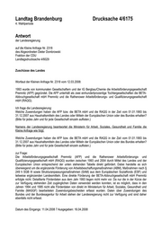 Landtag Brandenburg Drucksache 4/6175 4. Wahlperiode Antwort der Landesregierung auf die Kleine Anfrage Nr. 2318 des Abgeordneten Dieter Dombrowski Fraktion der CDU Landtagsdrucksache 4/6029 Zuschüsse des Landes Wortlaut der Kleinen Anfrage Nr. 2318 vom 12.03.2008: 1993 wurde von kommunalen Gesellschaftern und der IG Bergbau/Chemie die Arbeitsförderungsgesellschaft Premnitz (AFP) gegründet. Die AFP unterhält als zwei einhundertprozentige Tochtergesellschaften die BETA- Abbruchgesellschaft mbH Premnitz und die Rathenower Arbeitsförderungs- und Qualifizierungsgesellschaft mbH (RAQG). Ich frage die Landesregierung: Welche Zuwendungen haben die AFP bzw. die BETA mbH und die RAQG in der Zeit vom 01.01.1993 bis 31.12.2007 aus Haushaltsmitteln des Landes oder Mitteln der Europäischen Union oder des Bundes erhalten? (Bitte für jedes Jahr und für jede Gesellschaft einzeln auflisten.) Namens der Landesregierung beantwortet die Ministerin für Arbeit, Soziales, Gesundheit und Familie die Kleine Anfrage wie folgt: Welche Zuwendungen haben die AFP bzw. die BETA mbH und die RAQG in der Zeit vom 01.01.1993 bis 31.12.2007 aus Haushaltsmitteln des Landes oder Mitteln der Europäischen Union oder des Bundes erhalten? (Bitte für jedes Jahr und für jede Gesellschaft einzeln auflisten.) zur Frage: Die Arbeitsförderungsgesellschaft Premnitz (AFP) und die Rathenower Arbeitsförderungs- und Qualifizierungsgesellschaft mbH (RAQG) wurden zwischen 1993 und 2004 durch Mittel des Landes und der Europäischen Union entsprechend der unten stehenden Tabelle direkt gefördert. Dabei handelte es sich überwiegend um die ergänzende Förderung von Arbeitsbeschaffungsmaßnahmen (ABM), Maßnahmen nach § 249 h SGB III sowie Strukturanpassungsmaßnahmen (SAM) aus dem Europäischen Sozialfonds (ESF) und teilweise ergänzenden Landesmitteln. Eine direkte Förderung der BETA-Abbruchgesellschaft mbH Premnitz erfolgte nicht. Detaillierte Förderdaten aus dem Jahr 1993 liegen nicht mehr vor. Da nur die in der Kürze der zur Verfügung stehenden Zeit zugänglichen Daten verwendet werden konnten, ist es möglich, dass in den Jahren 1994 und 1995 nicht alle Förderdaten von direkt im Ministerium für Arbeit, Soziales, Gesundheit und Familie (MASGF) bearbeiteten Zuwendungsbescheiden erfasst wurden. Daten über Zuwendungen des Bundes und der Bundesagentur für Arbeit stehen der Landesregierung nicht zur Verfügung und sind daher ebenfalls nicht erfasst. Datum des Eingangs: 11.04.2008 7 Ausgegeben: 16.04.2008