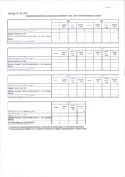Anlage 6 zu Frage 15 - KA 2721 Tatverdächtigenstruktur einzelner Deliktsfelder 2005 - 2011 im Inspektionsbereich Dahme-Spreewald 2005 2006 Heran- Heran- Jugend- Erwach- Jugend- Erwach- Kinder wachs- Kinder wachs- liehe sene liche sene ende ende Diebstahl an/aus Kraftfahrzeugen* 2 9 14 64 10 8 30 Illegale Einfuhr von Btm 1 Illegaler Handel/ Einfuhr/ Anbau Besitz in nicht geringer Menge 2 3 3 1 3 Sachbeschädigung durch Graffiti** 2007 2008 Heran- Heran- Jugend- Erwach- Jugend- Erwach- Kinder wachs Kinder wachs- liche sene liche sene end e - ende Diebstahl an/aus Kraftfahrzeugen* 1 12 11 27 3 5 10 37 Illegale Einfuhr von Btm 1 Illegaler Handel/ Einfuhr/ Anbau Besitz in nicht geringer Menge 2 1 3 Sachbeschädigung durch Graffiti** 7 46 23 24 2009 2010 Heran- Heran- Jugend- Erwach- Jugend- Erwach- Kinder wachs- Kinder wachs- liehe sene liche sene ende ende Diebstahl an/aus Kraftfahrzeugen* 9 18 31 2 10 45 Illegale Einfuhr von Btm Illegaler Handel/ Einfuhr/ Anbau Besitz in nicht geringer Menge 1 3 7 1 4 12 Sachbeschädigung durch Graffiti** 8 52 25 17 4 24 12 13 2011 Heran- Jugend- Erwach- Kinder w achs- liche sene ende Diebstahl an/aus Kraftfahrzeugen* 2 1 47 Illegale Einfuhr von Btm Illegaler Handel/ Einfuhr/ Anbau Besitz in nicht geringer Menge 5 27 Sachbeschädigung durch Graffiti** 2 11 8 4 " ab 2012 nur noch zusammengefasste Darstellung von Diebstahl in/aus Kraftfahrzeugen und Diebstahl an Kraftfahrzeugen Auswertung ist erst seit Umstellung der DV-Systeme und Einführung des 6-stelligen Straftatenkataloges im Jahr 2008 möglich.