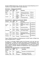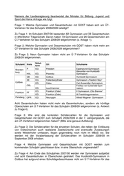 Namens der Landesregierung beantwortet der Minister für Bildung, Jugend und Sport die Kleine Anfrage wie folgt: Frage 1: Welche Gymnasien und Gesamtschulen mit GOST haben sich am Ü7- Verfahren für das Schuljahr 2008/2009 beteiligt? Zu Frage 1: Im Schuljahr 2007/08 bestanden 82 Gymnasien und 33 Gesamtschulen in öffentlicher Trägerschaft. Davon haben 73 Gymnasien und 25 Gesamtschulen am Ü 7-Verfahren für das Schuljahr 2008/09 teilgenommen (s. Anlage 1). Frage 2: Welche Gymnasien und Gesamtschulen mit GOST haben nicht mehr am Ü7-Verfahren für das Schuljahr 2008/2009 teilgenommen? Zu Frage 2: Neun Gymnasien haben nicht am Ü 7-Verfahren für das Schuljahr 2008/09 teilgenommen. Schul- Schulamt Kreis Ort Schulname form Branden- P OG Potsdam Espengrund-Gymnasium burg Alexander-von-Humboldt- HVL OG Premnitz Gymnasium CB OG Cottbus Humboldt-Gymnasium EE OG Falkenberg/Elster Gymnasium „Friedrich Stoy“ Cottbus OG Calau Carl-Anwandter-Gymnasium OSL Freifrau-von-Löwendal-Gym- OG Lauchhammer nasium OG Frankfurt (Oder) II Gymnasium „Otto Brenner“ Frankfurt FF OG Frankfurt (Oder) III Friedrichsgymnasium Perleberg OPR OG Neuruppin Alfred-Wegener -Gymnasium Acht Gesamtschulen haben nicht mehr als Gesamtschulen, sondern als künftige Oberschulen am Ü 7-Verfahren für das Schuljahr 2008/09 teilgenommen (s. Antwort zu Frage 4). Frage 3: Wie sind die konkreten Schülerzahlen für die Gymnasien und Gesamtschulen mit GOST zum Schuljahr 2008/2009 in der 7. Jahrgangsstufe, die am Ü7-Verfahren teilgenommen haben? (Bitte eine genaue Auflistung) Zu Frage 3: Die Schülerzahlen für die einzelnen Schulen, die neben der Einlösung von Erstwünschen auch realisierte Zweitwünsche und eventuelle Zuweisungen sowie Wiederholer umfassen, liegen gegenwärtig noch nicht im MBJS vor. Sie werden mit der Voraberfassung der Schülerzahlen im Schuljahr 2008/09 im September 2008 erhoben. Frage 4: Welche Gymnasien und Gesamtschulen mit GOST werden zum kommenden Schuljahr geschlossen bzw. in eine Oberschule umgewandelt? Zu Frage 4: Am Ende des Schuljahres 2007/08 werden vier Gymnasien aufgelöst und acht Gesamtschulen in Oberschulen geändert. Das Humboldt-Gymnasium in Cottbus hat aufgrund eines Schulträgerbeschlusses nicht am Ü 7-Verfahren für das