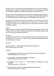 Dennoch kommt es bei einzelnen Berichtsprüfungen durch die ILB immer wieder zu Verzögerungen, die jedoch in der Regel auf die Vorlage von unvollständigen Unterlagen oder mangelnde Qualität der vorgelegten Projektberichte zurückzuführen sind. Bei dem in der Kleinen Anfrage zitierten Fall wurde die Verzögerung wegen Mängeln in der Bearbeitung der SPF-Projekte durch die Euroregion Spree-Neiße-Bober (SNB) und die unzulängliche Abrechnung der Ausgaben vom Projektträger selbst verursacht. Inzwischen wurden die Berichte der Euroregion SNB, in denen die Abrechnungen des Stadtsportbund Cottbus e.V. enthalten sind, durch die ILB am 31.01.2013 und am 27.03.2013 zertifiziert und der Euroregion SNB zur Vorlage bei den polnischen Verwal- tungsstellen zugestellt. Frage 3: Welche einzelnen Projekte und welche Projektträger/Projektantragsteller im Bereich des Sportes sind von der offenen Refinanzierung seit 2009 in Brandenburg betroffen (bitte einzeln nach den Jahresscheiben aufführen)? zu Frage 3: Alle folgenden SPF-Projekte mit offener Refinanzierung aus den Jahren 2009 bis ein- schließlich 2011 sind im 13. bzw. 14. Bericht der Euroregion Spree-Neiße-Bober enthal- ten (siehe Antwort zu Frage 2): Jahr 2009 Reitverein Sielow e.V „Binationales Springturnier Spree-Neiße-Bober“ offene Refinanzierung: 243,27 EUR Jahr 2010 (1) Polizeisportverein 1893 Forst e.V. „Reit und Springturnier 2010 Forst/Lausitz“ offene Refinanzierung: 1.249,92 EUR (2) 2. Stadt Guben „Wassersport-Olympiade Guben/Gubin“ offene Refinanzierung: 10.836,11 EUR (3) Leichtathletik Club Cottbus e.V. „Deutsch-polnisches Maimeeting Cottbus- Lubuskie“ offene Refinanzierung: 1.192,55 EUR (4) SV Chemie Guben 1990 e.V. „Grenzübergreifende Sportangebote“ offene Refinanzierung: 3.231,38 EUR