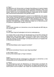 zu Frage 1: Die Bekämpfung der Schwarzarbeit und illegalen Beschäftigung ist originäre Aufgabe des Bundes in enger Zusammenarbeit mit allen betroffenen Behörden. Daher muss auf die gesetzlichen und verwaltungsmäßigen Maßnahmen des Bundes verwiesen werden, welche durch die Bundesfinanzverwaltung, insbesondere die dort eingebet- tete Finanzkontrolle Schwarzarbeit (FKS) getroffen werden. Das Schwarzarbeitsbekämpfungsgesetz normiert für die Zollbehörden einen gesetz- lichen Auftrag, Prüfungsmaßnahmen zur Bekämpfung der Schwarzarbeit durchzufüh- ren. Dies geschieht in enger Zusammenarbeit mit allen betroffenen und im Schwarz- arbeitsbekämpfungsgesetz festgeschriebenen Zusammenarbeitsbehörden. Eines separaten Prüfungsauftrages an die Zollbehörden bedarf es zur Wahrnehmung de- ren gesetzlich zugewiesenen Aufgaben somit nicht. Frage 2: Wie oft fanden Kontrollen von Unternehmen, die auf der Baustelle des BER tätig wa- ren und sind, statt? zu Frage 2: Für die Frage 2 liegt die Zuständigkeit nicht bei der Landesregierung. Ich verweise daher auf die Antwort der Bundesregierung auf die Kleine Anfrage der Abgeordneten Jutta Krellmann, Sabine Zimmermann, Diana Golze, weiterer Abge- ordneter und der Fraktion DIE LINKE - Drucksache 17/10011 vom 14. Juni 2012 zur Frage des Umgangs mit Werkverträgen und Subunternehmertum am Flughafen Ber- lin Brandenburg International. Frage 3: Wie viele Beschäftigte wurden insgesamt kontrolliert? Frage 4: Wie viele der kontrollierten Personen waren illegal beschäftigt? zu den Fragen 3 und 4: Es wird auf die Ausführungen zu Frage 2 verwiesen. Frage 5: Welche Möglichkeit sieht die Landesregierung, selbst etwas zu unternehmen, um die Schwarzarbeit auf der Großbaustelle BER zu bekämpfen? zu Frage 5: Die Landesregierung räumt der Bekämpfung von Schwarzarbeit und illegaler Be- schäftigung eine hohe Priorität ein. Schwarzarbeit und illegale Beschäftigung verur- sachen jährlich enorme Ausfälle in den Kassen der Sozialversicherung und bei den