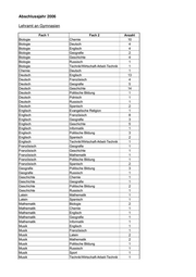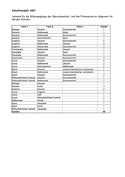 Abschlussjahr 2006 Lehramt für die Bildungsgänge der Sekundarstufe I und der Primarstufe an allgemein bil- denden Schulen Fach 1 Fach 2 Fach 3 Anzahl Biologie Mathematik Sachunterricht 2 Deutsch Mathematik Musik 2 Deutsch Mathematik Sachunterricht 13 Deutsch Musik Sachunterricht 1 Deutsch Sport Sachunterricht 1 Englisch Deutsch Sachunterricht 11 Englisch Deutsch Sport 1 Englisch Mathematik Deutsch 3 Englisch Mathematik Sport 1 Geografie Deutsch Sachunterricht 1 Geografie Mathematik Deutsch 1 Geografie Mathematik Sachunterricht 1 Geschichte Deutsch Sachunterricht 4 Kunst Deutsch Sachunterricht 4 Kunst Mathematik Deutsch 2 Mathematik Deutsch Kunst 1 Mathematik Sachunterricht Deutsch 1 Musik Deutsch Sachunterricht 2 Politische Bildung Mathematik Sachunterricht 1 Sport Mathematik Kunst 1 Wirtschaft-Arbeit-Technik Mathematik Sachunterricht 1 Biologie Deutsch 1 Biologie Kunst 3 Deutsch Englisch 3 Deutsch Geografie 2 Deutsch Geschichte 4 Deutsch Mathematik 2 Deutsch Wirtschaft-Arbeit-Technik 2 Englisch Kunst 2 Französisch Englisch 1 Kunst Deutsch 4 Kunst Geschichte 1 Kunst Wirtschaft-Arbeit-Technik 3 Mathematik Physik 1 Musik Deutsch 2 Musik Geschichte 1 Musik Kunst 1 Politische Bildung Deutsch 1 Sport Deutsch 1 Summe 90