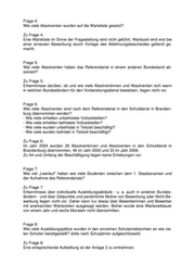 Frage 4: Wie viele Absolventen wurden auf die Warteliste gesetzt? Zu Frage 4: Eine Warteliste im Sinne der Fragestellung wird nicht geführt. Wartezeit wird erst bei einer erneuten Bewerbung durch Vorlage des Ablehnungsbescheides geltend ge- macht. Frage 5: Wie viele Absolventen haben das Referendariat in einem anderen Bundesland ab- solviert? Zu Frage 5: Erkenntnisse darüber, ob und wie viele Absolventinnen und Absolventen sich wann in welchen Bundesländern für den Vorbereitungsdienst bewerben, liegen nicht vor. Frage 6: Wie viele Absolventen sind nach dem Referendariat in den Schuldienst in Branden- burg übernommen worden? - Wie viele erhielten unbefristete Vollzeitstellen? - Wie viele erhielten befristete Vollzeitstellen? - Wie viele wurden unbefristet in Teilzeit beschäftigt? - Wie viele wurden befristet in Teilzeit beschäftigt? Zu Frage 6: Im Jahr 2004 wurden 29 Absolventinnen und Absolventen in den Schuldienst in Brandenburg übernommen, 46 im Jahr 2005 und 33 im Jahr 2006. Zu Art und Umfang der Beschäftigung liegen keine Erhebungen vor. Frage 7: Wie viel „Leerlauf“ hatten wie viele Studenten zwischen dem 1. Staatsexamen und der Aufnahme des Referendariats? Zu Frage 7: Erkenntnisse über individuelle Ausbildungsabläufe - u. a. auch in anderen Bundes- ländern - und über Zeitpunkte und persönliche Motive von Bewerbung oder Nicht-Be- werbung liegen nicht vor. Daher kann nur etwas über Bewerberinnen und Bewerber mit anerkannten Wartezeiten ausgesagt werden. Bisher wurde eine Wartezeitdauer von einem Jahr und sechs Monaten nicht überschritten. Frage 8: Wie viele Ausbildungsplätze wurden in den einzelnen Schulamtsbezirken an wie vie- len Schulen bereitgestellt? (bitte nach Schuljahren aufgeschlüsselt) Zu Frage 8: Eine entsprechende Aufstellung ist der Anlage 2 zu entnehmen.