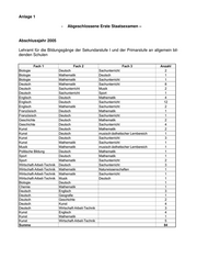 Anlage 1 - Abgeschlossene Erste Staatsexamen – Abschlussjahr 2005 Lehramt für die Bildungsgänge der Sekundarstufe I und der Primarstufe an allgemein bil- denden Schulen Fach 1 Fach 2 Fach 3 Anzahl Biologie Deutsch Sachunterricht 2 Biologie Mathematik Deutsch 1 Biologie Mathematik Sachunterricht 1 Deutsch Mathematik Sachunterricht 8 Deutsch Sachunterricht Musik 2 Deutsch Sachunterricht Sport 1 Englisch Deutsch Mathematik 4 Englisch Deutsch Sachunterricht 12 Englisch Mathematik Sachunterricht 2 Französisch Deutsch Mathematik 1 Französisch Deutsch Sachunterricht 1 Geschichte Deutsch Mathematik 2 Geschichte Deutsch Sachunterricht 4 Kunst Deutsch Mathematik 2 Kunst Deutsch musisch-ästhetischer Lernbereich 1 Kunst Deutsch Sachunterricht 3 Kunst Mathematik Sachunterricht 1 Musik Mathematik musisch-ästhetischer Lernbereich 1 Politische Bildung Deutsch Mathematik 1 Sport Deutsch Mathematik 1 Sport Mathematik Sachunterricht 2 Wirtschaft-Arbeit-Technik Deutsch Sachunterricht 3 Wirtschaft-Arbeit-Technik Mathematik Naturwissenschaften 1 Wirtschaft-Arbeit-Technik Mathematik Sachunterricht 1 Wirtschaft-Arbeit-Technik Musik Deutsch 1 Biologie Deutsch 1 Chemie Mathematik 1 Deutsch Englisch 3 Deutsch Geografie 1 Deutsch Geschichte 2 Deutsch Kunst 4 Deutsch Wirtschaft-Arbeit-Technik 3 Kunst Englisch 4 Kunst Mathematik 1 Kunst Wirtschaft-Arbeit-Technik 5 Summe 84
