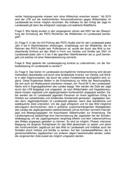 rechte Verjüngungsziele müssen sich ohne Wildschutz erreichen lassen.“ Ab 2015 wird der LFB auf die herkömmlichen Schutzmaßnahmen gegen Wildschäden im Landeswald wo immer möglich verzichten. Als Indikator für den Erfolg der Jagd im Landeswald gilt dann die erfolgreich verjüngte und etablierte Waldfläche. Frage 5: Wie häufig wurden in den vergangenen Jahren seit 2001 bei der Überprü- fung der Einhaltung der PEFC-Richtlinien die Wilddichten im Landeswald bemän- gelt? Zu Frage 5: In die Vor-Ort-Prüfung des PEFC-Audits sind für den Landeswald jedes Jahr 4 bis 6 Oberförstereien einbezogen. Unabhängig von der Wilddichte, die im Rahmen des PEFC-Audits kein Prüfkriterium ist, wurde der durch das Wild zu be- obachtende Einfluss auf den Wald in Form von Verbiss und Schäle seit 2001 im Landeswald jedes Jahr in 2 bis 4 der geprüften Oberförstereien als zu groß bemän- gelt und solches mit einer Nebenabweichung vermerkt. Frage 6: Was gedenkt die Landesregierung konkret zu unternehmen, um die Ver- bissbelastung im Landeswald zu senken? Zu Frage 6: Das bisher im Landeswald durchgeführte Verbissmonitoring wird derzeit methodisch überarbeitet und durch eine landesweite Inventur von Verbiss und Schä- le in allen Eigentumsarten, die durch die untere Forstbehörde durchgeführt wird, er- gänzt. Diese Ergebnisse fließen in die Entscheidung zur Höhe der Abschusspläne, die sich auch am Waldzustand orientieren müssen, ein. Rund 90 % der Landeswald- fläche wird in Eigenjagdbezirken des Landes bejagt. Hier werden die Ziele der Jagd durch den LFB festgelegt und umgesetzt. Je nach Wildschäden und Vegetationszu- stand müssen Jagdziele und Jagdorganisation kontinuierlich angepasst werden. Da- bei werden die im Landeswald jagenden Personen an ihrem jagdlichen Erfolg im Hinblick auf verbeißendes und schälendes Schalenwild gemessen. Jagdgästen wer- den dann Jagdmöglichkeiten im Landeswald geboten, wenn dies betriebliche und waldbauliche Ziele unterstützt. Um die Jagd erfolgreich und für das Wild möglichst störungsarm durchzuführen, wird in größeren zusammenhängenden Waldgebieten des Landes die Jagdorganisation weiterentwickelt und es kommen vermehrt Intervall- jagd und Bewegungsjagden mit brauchbaren Stöberhunden zur Anwendung. Die Landesregierung beabsichtigt eine Harmonisierung der Jagdzeiten bei der Schalen- wildbejagung, um die Jagdorganisation langfristig effektiv und dem Lebensrhythmus des Wildes angepasst gestalten zu können. So wird es möglich, Phasen intensiver Bejagung mit längeren Ruhephasen für das Wild abwechseln zu lassen und damit den kontinuierlichen Jagddruck auf das Wild im Landeswald und mittelbar auch die Schäden durch Verbiss und Schäle zu senken. Auf den Landeswaldflächen, die in gemeinschaftlichen Jagdbezirken von anderen Jägern bewirtschaftet werden, sollen die vorgenannten Ziele soweit als möglich umgesetzt werden.