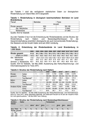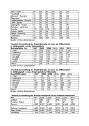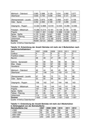 Märkisch - Oderland 2.965 2.988 3.129 3.041 2.992 3.077 Oberhavel 4.830 4.793 4.638 4.942 5.121 5.335 Oberspreewald - Lausitz 3.655 3.973 4.082 3.963 4.427 4.109 Oder - Spree 3.052 2.992 3.189 3.181 3.289 3.243 Ostprignitz - Ruppin 12.322 12.869 12.518 12.433 12.290 12.092 Potsdam - Mittelmark 10.286 10.314 10.181 10.129 9.725 9.190 Prignitz 11.822 11.901 12.862 12.888 12.540 12.800 Spree - Neiße 4.133 4.440 4.647 4.683 4.809 4.933 Teltow - Fläming 4.019 3.987 3.986 4.031 4.039 3.715 Uckermark 9.461 9.727 12.182 9.915 9.608 9.337 Summe 90285 92123 96553 94242 95295 95849 Quelle: InVeKos Datenbanken Tabelle 10: Entwicklung der Anzahl Betriebe mit mehr als 5 Mutterkühen nach Landwirtschaftsämtern Amt 2007 2008 2009 2010 2011 2012 Cottbus 4 5 5 5 5 5 Frankfurt (Oder) 1 1 1 0 1 1 Barnim 48 49 47 49 51 46 Dahme - Spreewald 96 99 94 98 95 96 Elbe - Elster 94 94 97 95 92 94 Havelland 91 85 92 87 95 91 Märkisch - Oderland 46 44 46 45 48 52 Oberhavel 97 106 101 103 101 103 Oberspreewald - Lausitz 67 69 73 71 75 68 Oder - Spree 53 50 59 59 53 56 Ostprignitz - Ruppin 158 162 167 164 166 163 Potsdam - Mittelmark 144 135 144 141 141 138 Prignitz 167 166 174 166 170 166 Spree - Neiße 71 75 75 71 67 74 Teltow - Fläming 52 49 43 47 43 41 Uckermark 114 112 120 120 119 113 Summe 1303 1301 1338 1321 1322 1307 Quelle: InVeKos Datenbanken Tabelle 11: Entwicklung der Anzahl Betriebe mit mehr als 5 Mutterkühen in Abhängigkeit von der Betriebsfläche Betriebsfläche (ha) 2007 2008 2009 2010 2011 2012 >1500 59 56 55 52 46 49 >1000-1500 52 53 64 55 54 49 >500-1000 103 112 122 129 132 131 >200-500 254 249 257 249 255 252