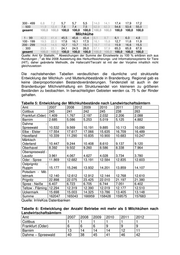 300 - 499 6,8 7,2 5,7 5,7 5,5 14,0 14,1 17,4 17,9 17,2 11,9 12,4 7,6 7,4 7,5 62,9 62,3 54,6 53,6 55,0 gesamt 100,0 100,0 100,0 100,0 100,0 100,0 100,0 100,0 100,0 100,0 Milchkühe 1 - 99 42,3 41,4 45,5 45,6 43,4 8,1 8,7 6,1 6,0 4,8 100 - 199 19,5 22,0 17,6 16,1 17,5 16,1 15,8 12,7 11,6 11,9 200 - 299 14,8 14,5 12,7 13,7 13,1 18,7 17,6 15,9 16,6 15,5 23,5 22,1 24,1 24,5 26,0 57,1 57,9 65,3 65,8 67,8 gesamt 100,0 100,0 100,0 100,0 100,0 100,0 100,0 100,0 100,0 100,0 1 Quelle: Amt für Statistik; Abweichungen der Summe der Einzelwerte zu 100 % erklären sich aus 2 Rundungen ; ab Mai 2008 Auswertung des Herkunftssicherungs- und Informationssystems für Tiere (HIT), daher geänderte Methodik, die Halterzahl/Tierzahl ist mit der der Vorjahre inhaltlich nicht gleichzusetzen Die nachstehenden Tabellen verdeutlichen die räumliche und strukturelle Entwicklung der Milchkuh- und Mutterkuhbestände in Brandenburg. Regional gab es keine überproportionalen Bestandsveränderungen. Tendenziell ist auch in der Brandenburger Milchviehhaltung ein Strukturwandel von kleineren zu größeren Beständen zu beobachten. In benachteiligten Gebieten werden ca. 75 % der Rinder gehalten. Tabelle 5: Entwicklung der Milchkuhbestände nach Landwirtschaftsämtern Amt 2007 2008 2009 2010 2011 2012 Cottbus 245 241 242 245 238 263 Frankfurt (Oder) 1.409 1.767 2.197 2.032 2.206 2.088 Barnim 2.685 5.086 5.253 5.019 5.125 4.882 Dahme - Spreewald 10.532 9.569 10.191 9.885 10.113 10.090 Elbe - Elster 17.554 17.617 17.066 15.635 16.709 16.489 Havelland 10.339 11.290 10.835 10.900 10.683 10.247 Märkisch - Oderland 10.447 9.244 10.408 8.610 9.137 9.120 Oberhavel 8.392 9.502 9.260 8.586 8.338 7.964 Oberspreewald - Lausitz 3.961 4.067 4.627 4.028 3.734 3.780 Oder - Spree 11.869 12.682 13.191 12.584 12.835 12.603 Ostprignitz - Ruppin 15.177 15.246 13.932 14.201 13.859 14.107 Potsdam - Mit- telmark 12.140 12.612 12.912 12.144 12.768 12.610 Prignitz 22.898 22.075 23.425 22.010 21.197 21.380 Spree - Neiße 6.407 6.723 6.705 6.744 7.051 6.402 Teltow - Fläming 12.294 12.319 12.390 12.019 12.177 12.510 Uckermark 15.698 15.003 14.325 13.786 13.405 13.148 Summe 162047 165043 166959 158428 159575 157683 Quelle: InVeKos Datenbanken Tabelle 6: Entwicklung der Anzahl Betriebe mit mehr als 5 Milchkühen nach Landwirtschaftsämtern Amt 2007 2008 2009 2010 2011 2012 Cottbus 1 1 1 1 1 1 Frankfurt (Oder) 6 6 6 9 9 9 Barnim 13 14 14 14 12 11 Dahme – Spreewald 40 38 45 41 46 42