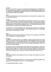 2 zu Frage 1: Bei den am 21./22.11.2011 und am 30./31.12.2011 infolge der Brandereignisse in der ehemaligen Flä- ming Sortieranlagen GmbH entstandenen Brandabfällen ist erfahrungsgemäß davon auszugehen, dass sie infolge ihrer Schadstoffgehalte als gefährlich einzustufen sind (die umgangssprachliche Bezeich- nung für gefährlichen Abfall ist oft Sondermüll). Frage 2: Wenn ja, welche Maßnahmen wurden bereits durchgeführt, um den Sondermüll zu entsorgen, und wel- che stehen warum noch aus? zu Frage 2: In diesem Zusammenhang kann auf die Beantwortung der Mündlichen Anfrage 912 zur 52. Landtagsit- zung am 21. März 2012 durch Frau Ministerin Tack verwiesen werden. In ihrem Redebeitrag legte Frau Ministerin Tack dar, dass die seitens der Unteren Boden- und Wasserschutzbehörde des Landkreises Potsdam-Mittelmark nach den Bränden eingeleiteten Boden- und Grundwasseruntersuchungen keine Anhaltspunkte für eine bestehende konkrete Gefahr erkennen lassen. Die untere Boden- und Wasserschutzbehörde des Landkreises führt auch weiterhin ein Grundwasser- monitoring durch, um eventuelle Veränderungen in der Schadstoffkonzentration und im Schadstoffin- ventar erfassen und darauf reagieren zu können. Frage 3: Welche öffentliche Stelle ist neben Eigentümer und Verursacher für die Entsorgung von Brandresten und für die Entsorgung von Sondermüll zuständig? zu Frage 3: Grundsätzlich ist zunächst zu prüfen, ob ein Pflichtiger in Anspruch genommen werden kann. Hierzu zählen der Verursacher und der Grundstückseigentümer. Sofern Abfallanlieferer bekannt sind, besteht die Möglichkeit, diese als weitere Pflichtige heranzuziehen. Dies ist jedoch ein sehr zeitaufwendiger Prozess, dessen Erfolg vom Ergebnis der Suche nach den ehemaligen Abfallanlieferern sowie von de- ren Existenz und Solvenz abhängt. Eine Ersatzvornahme mit finanziellen Mitteln der öffentlichen Hand kommt dagegen nur nachrangig - insbesondere bei Vorliegen einer konkreten Gefahr und sofern ein Pflichtiger nicht rechtzeitig in An- spruch genommen werden kann - in Betracht. Eine solche konkrete Gefahr liegt im Fall der illegalen Ablagerung in Niemegk nach den Prüfungen des Landkreises Potsdam-Mittelmark derzeit nicht vor. Frage 4: Welche Kosten entstehen für die Entsorgung und wer hat sie zu tragen, wenn Eigentümer und Verursa- cher ausfallen? zu Frage 4: Für die Entsorgung der Brandreste inklusive der zur Abdeckung der Brandnester eingesetzten Sand- mengen wird von Aufwendungen in Höhe von ca. 1,3 Mio. € ausgegangen. Zur Kostentragung siehe Antwort zu Frage 3.