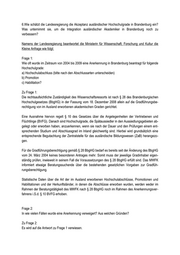 Landtag Brandenburg Drucksache 4/7592 4. Wahlperiode Antwort der Landesregierung auf die Kleine Anfrage Nr. 2841 des Abgeordneten Peer Jürgens Fraktion DIE LINKE Landtagsdrucksache 4/7481 Anerkennung von ausländischen Hochschul-Abschlüssen Wortlaut der Kleinen Anfrage Nr. 2841 vom 21.04.2009: Nicht erst durch den Bologna-Prozess ist eine Mobilität von Wissenschaftlern und Akademikern vor dem Hintergrund der Internationalisierung und des Fachkräftemangels wünschenswert. Eine Anerken- nung von ausländischen Hochschulgraden wird unter anderem im Hochschulgesetz geregelt. Ich frage die Landesregierung: 1.Wie oft wurde im Zeitraum von 2004 bis 2009 eine Anerkennung in Brandenburg beantragt für folgende Hochschulgrade: a) Hochschulabschluss (bitte nach den Abschlussarten unterscheiden) b) Promotion c) Habilitation? 2.In wie vielen Fällen wurde eine Anerkennung verweigert? Aus welchen Gründen? 3.Wie setzen sich die Anträge auf Anerkennung nach Ländern zusammen? 4.In wie vielen Fällen wurde seit 2004 von Abs. 7 des § 28 Brandenburgisches Hochschulgesetz Gebrauch gemacht? (bitte nach Punkt 1 – 3 aufschlüsseln) 5.Inwiefern sind der Landesregierung Fälle bekannt, in denen eine Promotion, eine Berufung oder eine Arbeitsaufnahme durch eine abgelehnte Anerkennung von ausländischen Hochschulgraden verhindert bzw. durch ein langwieriges Verfahren erheblich verzögert wurden? Datum des Eingangs: 18.05.2009 / Ausgegeben: 25.05.2009
