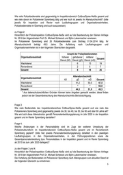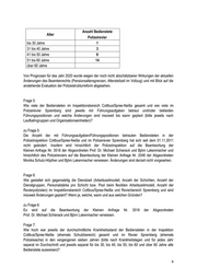 Anzahl Bedienstete Alter Polizeirevier bis 30 Jahre 1 31 bis 40 Jahre 3 41 bis 50 Jahre 8 51 bis 60 Jahre 14 über 60 Jahre Von Prognosen für das Jahr 2020 wurde wegen der noch nicht abschätzbaren Wirkungen der aktuellen Änderungen des Beamtenrechts (Pensionsaltersgrenzen, Altersteilzeit im Vollzug) und mit Blick auf die anstehende Evaluation der Polizeistrukturreform abgesehen. Frage 5: Wie viele der Bediensteten im Inspektionsbereich Cottbus/Spree-Neiße gesamt und wie viele im Polizeirevier Spremberg sind jeweils mit Führungsaufgaben betraut und/oder bekleiden Führungspositionen und welche Änderungen sind insoweit bis wann geplant (bitte jeweils nach Laufbahngruppen und Organisationseinheiten)? zu Frage 5: Die Anzahl der mit Führungsaufgaben/Führungspositionen betrauten Bediensteten in der Polizeiinspektion Cottbus/Spree-Neiße und im Polizeirevier Spremberg hat sich seit dem 01.11.2011 nicht geändert. Insofern wird hinsichtlich der Polizeiinspektion auf die Beantwortung der Kleinen Anfrage Nr. 3518 der Abgeordneten Prof. Dr. Michael Schierack und Björn Lakenmacher und hinsichtlich des Polizeireviers auf die Beantwortung der Kleinen Anfrage Nr. 2046 der Abgeordneten Monika Schulz-Höpfner und Björn Lakenmacher verwiesen. Änderungen sind derzeit nicht vorgesehen. Frage 6: Wie gestaltet sich gegenwärtig die Dienstzeit (Arbeitszeitmodell, Anzahl der Schichten, Anzahl der Dienstgruppen, Personalstärke pro Schicht bzw. Pool beim flexiblen Arbeitszeitmodell, Anzahl der Revierpolizisten) im Inspektionsbereich Cottbus/Spree-Neiße und Revierbereich Spremberg und sind insoweit Änderungen geplant? Wenn ja, welche, wann und aus welchen Gründen? zu Frage 6: Es wird auf die Beantwortung der Kleinen Anfrage Nr. 3518 der Abgeordneten Prof. Dr. Michael Schierack und Björn Lakenmacher verwiesen. Frage 7: Wie hoch war jeweils der durchschnittliche Krankheitsstand der Bediensteten in der Inspektion Cottbus/Spree-Neiße (ehemals Schutzbereich) gesamt und im Revier Spremberg (ehemals Polizeiwache) in den vergangenen sieben Jahren (bitte nach Krankheitstagen und für jedes Jahr separat im Durchschnitt und jeweils separat für bis 30, bis 40, bis 50, bis 60 und über 60 Jahre alte Bedienstete ausweisen)?