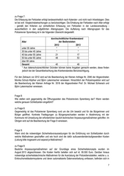 zu Frage 7: Die Erfassung der Fehlzeiten erfolgt landeseinheitlich nach Kalender- und nicht nach Arbeitstagen. Dies ist bei evtl. Vergleichsbetrachtungen zu berücksichtigen. Die Erhebung der Fehlzeiten nach Alter erfolgt - gemäß den Kriterien zur einheitlichen Erfassung von Fehlzeiten in der Landesverwaltung - ausschließlich in den aufgeführten Altersgruppen. Die Aufteilung nach Altersgruppen für das Polizeirevier Spremberg ist in der folgenden Übersicht dargestellt: durchschnittlicher Krankenstand Alter der Bediensteten 2012 2013 unter 30 Jahre * * 30 bis unter 40 Jahre * * 40 bis unter 50 Jahre 21 17 50 bis unter 60 Jahre 48 53 über 60 Jahre Gesamt 40 48 * Aus datenschutzrechtlichen Gründen können keine Angaben gemacht werden, diese finden jedoch bei der Gesamtbetrachtung des Krankenstandes Berücksichtigung. Für den Zeitraum vor 2012 wird auf die Beantwortung der Kleinen Anfrage Nr. 2046 der Abgeordneten Monika Schulz-Höpfner und Björn Lakenmacher verwiesen. Hinsichtlich der Polizeiinspektion wird auf die Beantwortung der Kleinen Anfrage Nr. 3518 der Abgeordneten Prof. Dr. Michael Schierack und Björn Lakenmacher verwiesen. Frage 8: Wie stellen sich gegenwärtig die Öffnungszeiten des Polizeireviers Spremberg dar? Wann werden welche genauen Schließzeiten eingeführt? zu Frage 8: Gegenwärtig ist das Polizeirevier Spremberg rund um die Uhr besetzt und für die Bürgerinnen und Bürger geöffnet. Konkrete Festlegungen zu Bürgersprechzeiten werden in Abstimmung mit der Kommune mit Umsetzung der erforderlichen baulich-technischen Anpassungsmaßnahmen getroffen. Im Übrigen wird auf die Beantwortung der Frage 9 verwiesen. Frage 9: Wann sind die notwendigen Sicherheitsvoraussetzungen für die Einführung von Schließzeiten durch welche Maßnahmen geschaffen und wie hoch sind die dafür aufzuwendenden/aufgewandten Kosten (Listung bitte insgesamt und separat je Maßnahme)? zu Frage 9: Bauliche Anpassungsmaßnahmen auf der Grundlage eines Sicherheitskonzepts wurden im August 2013 abgeschlossen. Die Kosten hierfür beliefen sich auf rd. 95.500 Euro. Darüber hinaus notwendige sicherheitstechnische Maßnahmen für die Ausrüstung der Polizeidienststellen, welche u. a. Einbruchsmeldealarmsysteme und deren automatisierte Datenverarbeitung umfassen, befinden sich in
