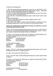 Ich frage die Landesregierung: 1. Wie viele Kostenerstattungsvereinbarungen waren bis zum 25.04.2013 mit Ein- wohnern der Gemeinde Blankenfelde-Mahlow abgeschlossen worden – differenziert nach den Ortsteilen Blankenfelde, Mahlow und Dahlewitz? 2. Trifft es zu, dass diese Kostenerstattungsvereinbarungen auf dem alten Schall- schutzniveau NAT 6 x 55 dB(A) beruhten? 3. Wie viele dieser Kostenerstattungsvereinbarungen wurden baulich bereits umge- setzt? 4. Was hat das gekostet? 5. Trifft es zu, dass dieser Schallschutz wieder ausgebaut werden muss? 6. Was kostet dieser Ausbau? 7. Wie soll nun den Bürgern rechtlich korrekter Schallschutz, basierend auf dem Planfeststellungsbeschluss und dem Urteil des OVG konkret gewährt werden? Namens der Landesregierung beantwortet der Minister für Infrastruktur und Land- wirtschaft die Kleine Anfrage wie folgt: Frage 1: Wie viele Kostenerstattungsvereinbarungen waren bis zum 25.04.2013 mit Einwohnern der Gemeinde Blankenfelde-Mahlow abgeschlossen worden – differen- ziert nach den Ortsteilen Blankenfelde, Mahlow und Dahlewitz? Zu Frage 1: Laut Auskunft der FBB wurden im folgenden Umfang beidseitig unter- schriebene Kostenerstattungsvereinbarungen abgeschlossen: Im Tagschutzgebiet: Blankenfelde: 1 286 Wohneinheiten Mahlow: 601 Wohneinheiten Dahlewitz: 82 Wohneinheiten Im reinen Nachtschutzgebiet: Blankenfelde: 7 Wohneinheiten Mahlow: 122 Wohneinheiten Dahlewitz: 39 Wohneinheiten Frage 2: Trifft es zu, dass diese Kostenerstattungsvereinbarungen auf dem alten Schallschutzniveau NAT 6 x 55 dB(A) beruhten? Zu Frage 2: Laut Auskunft der FBB trifft dies zu. Frage 3: Wie viele dieser Kostenerstattungsvereinbarungen wurden baulich bereits umgesetzt? Zu Frage 3: Laut Auskunft der FBB wurden im folgenden Umfang bauliche Schall- schutzmaßnahmen umgesetzt: Im Tagschutzgebiet: Blankenfelde: 824 Wohneinheiten Mahlow: 332 Wohneinheiten Dahlewitz: 49 Wohneinheiten Im reinen Nachtschutzgebiet: Blankenfelde: 6 Wohneinheiten