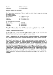 Mahlow: 66 Wohneinheiten Dahlewitz: 25 Wohneinheiten Frage 4: Was hat das gekostet? Zu Frage 4: Laut Auskunft der FBB sind dafür finanzielle Mittel im folgenden Umfang eingesetzt worden: Im Tagschutzgebiet: Blankenfelde: ca. 6,6 Millionen Euro Mahlow: ca. 2,8 Millionen Euro Dahlewitz: ca. 0,4 Millionen Euro Im reinen Nachtschutzgebiet: Blankenfelde: ca. 15 000 Euro Mahlow: ca. 93 000 Euro Dahlewitz: ca. 59 000 Euro Frage 5: Trifft es zu, dass dieser Schallschutz wieder ausgebaut werden muss? Frage 6: Was kostet dieser Ausbau? Zu Frage 5 und 6: Laut Auskunft der FBB steht noch nicht fest, ob bzw. wie viele Schallschutzeinrichtungen wieder ausgebaut werden müssen Frage 7: Wie soll nun den Bürgern rechtlich korrekter Schallschutz, basierend auf dem Planfeststellungsbeschluss und dem Urteil des OVG konkret gewährt werden? Zu Frage 7: Laut Auskunft der FBB ist folgende Vorgehensweise beabsichtigt. Zu- nächst müssen innerhalb des Tagschutzgebietes erneute Bestandsaufnahmen in den betroffenen Objekten durchgeführt werden, um die notwendigen baulichen Schallschutzmaßnahmen bemessen zu können, die den Anforderungen aus dem Urteil des Oberverwaltungsgerichts Berlin-Brandenburg vom 25. April 2013 entspre- chen. Das Ergebnis wird dem Antragssteller in einer Anspruchsermittlung mitgeteilt. Dabei erhält er auch ein detailliertes Leistungsverzeichnis der notwendigen baulichen Maßnahmen, auf deren Basis die Umsetzung erfolgen soll. Sollten die Kosten der Schallschutzmaßnahmen mehr als 30 Prozent des Verkehrswertes des Objektes be- tragen, ist gemäß Planfeststellung eine finanzielle Entschädigung der Anwohner vor- gesehen.