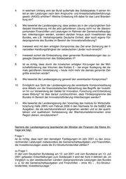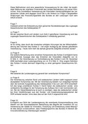 4. In welchem Umfang wird der Bund außerhalb des Solidarpaktes II seinen An- teil an den Leistungen nach dem Anspruchs- und Anwartschaftsüberführungs- gesetz (AAÜG) erhöhen? Welche Entlastung tritt dabei für das Land Branden- burg ein? 5. Wie bewertet die Landesregierung, dass anders als in der ursprünglichen Soli- darpakt-Vereinbarung mit der jetzt gefundenen Lösung nicht nur die überpro- portionalen Finanzhilfen und Leistungen im Rahmen der Gemeinschaftsaufga- ben miteinbezogen werden, sondern darüber hinaus auch Investitionen des Bundes, wie z.B. Verkehrsprojekte Deutsche Einheit, aber auch eigene För- derprogramme des Bundes im Bereich der Innovationsförderung? 6. Inwieweit wird mit dem erfolgten Kompromiss das Ziel einer Sicherung der fi- nanziellen Handlungsfähigkeit der ostdeutschen Länder noch erreicht? 7. Inwieweit sichert die Einbeziehung oben genannter Bundesleistungen das zu- gesagte Gesamtvolumen des Solidarpaktes II? 8. Ist es richtig, dass durch die inzwischen erfolgten Kürzungen bei der Wirt- schaftsförderung das Volumen des Korbes 2 – bei enger Auslegung der da- mals getroffenen Vereinbarung – heute nicht mehr die damals genannte Ziel- größe erreichen würde? 9. Wie bewertet die Landesregierung generell den vereinbarten Kompromiss? 10. Ermöglicht aus Sicht der Landesregierung die vereinbarte Kompromisslösung eine Abkehr von der finanzstatistischen Betrachtung des Begriffs der Investiti- on hin zur Verwendung der Gelder für Innovation, Forschung und Entwicklung sowie Bildung? Ist dies darauf zurückzuführen, dass Förderprogramme des Bundes im Bereich der Innovationsförderung miteinbezogen werden? 11. Wie bewertet die Landesregierung den Vorschlag des Instituts für Wirtschafts- forschung Halle (IWH) vom Februar 2006 in den Nachweis für die SoBEZ alle Ausgaben, die als wachstumsrelevant angesehen werden und so der quanti- tativen und qualitativen Verbesserung der Wachstumsdeterminanten einer Region dienen, einzubeziehen? Namens der Landesregierung beantwortet der Minister der Finanzen die Kleine An- frage wie folgt: Frage 1: Ist es richtig, dass nach den damaligen Festlegungen im Jahr 2001 zu den einzu- rechnenden Leistungen insbesondere die Gemeinschaftsaufgaben und Finanzhilfen, die Investitionszulagen sowie die EU-Strukturfondsmittel zählten? zu Frage 1: In den vom Deutschen Bundestag am 12. Juli 2001 und vom Bundesrat am 13. Juli 2001 gefassten Entschließungen zum Solidarpakt II wird der Korb II definiert als „im Vergleich zu den westdeutschen Ländern überproportionale Leistungen des Bundes u. a. für die Gemeinschaftsaufgaben und Finanzhilfen – ohne IfG – , EU-Struktur- fondsmittel, Investitionszulage.“