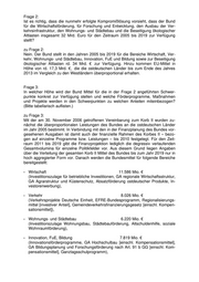 Landtag Brandenburg Drucksache 4/4090 4. Wahlperiode Antwort der Landesregierung auf die Kleine Anfrage 1555 der Abgeordneten Ralf Christoffers und Thomas Domres Fraktion der Linkspartei.PDS Landtagsdrucksache 4/3985 Wortlaut der Kleinen Anfrage Nr. 1555 vom 21.12.2006: „Einigung über den Korb 2 des Solidarpaktes II“ Der Bund und die ostdeutschen Bundesländer haben sich Ende November Anfang Dezember 2006 nach langwierigen Verhandlungen über die Definition des so ge- nannten Korb 2 im Solidarpakt II verständigt. Damit wurde eine Vereinbarung aus dem Jahr 2001 konkretisiert, nach der der Bund den ostdeutschen Bundesländern für überproportionale Leistungen insgesamt rd. 51 Mrd. Euro zugesagt hatte. Be- gründet werden diese Sonderbedarfsbundesergänzungszuweisungen (SoBEZ) in § 11 Abs. 3 FAG mit dem Fortbestand von „teilungsbedingter Sonderlasten aus dem bestehenden starken infrastrukturellen Nachholbedarf“ sowie mit der „unterproportio- nalen kommunalen Finanzkraft“ der ostdeutschen Länder. Dem Grunde nach sollten den ostdeutschen Ländern unabhängig von etwaigen Veränderungen in der Finanz- verfassung Zahlungen aus den diversen Mischfinanzierungstatbeständen sowie der Europäischen Union gesichert werden. Strittig war bis zuletzt, welche Leistungen konkret in den Korb 2 einzubeziehen seien. Wir fragen die Landesregierung: 1. Ist es richtig, dass nach den damaligen Festlegungen im Jahr 2001 zu den einzurechnenden Leistungen insbesondere die Gemeinschaftsaufgaben und Finanzhilfen, die Investitionszulagen sowie die EU-Strukturfondsmittel zählten? 2. Ist es richtig, dass die nunmehr erfolgte Kompromißlösung vorsieht, dass der Bund für die Wirtschaftsförderung, für Forschung und Entwicklung, den Aus- bau der Verkehrsinfrastruktur, den Wohnungs- und Städtebau und die Beseiti- gung ökologischer Altlasten insgesamt 32 Mrd. Euro für den Zeitraum 2005 bis 2019 zur Verfügung stellt? 3. In welcher Höhe wird der Bund Mittel für die in der Frage 2 angeführten Schwerpunkte konkret zur Verfügung stellen und welche Förderprogramme, Maßnahmen und Projekte werden in den Schwerpunkten zu welchen Anteilen miteinbezogen? (Bitte tabellarisch auflisten.) Datum des Eingangs: 23.01.2007 / Ausgegeben: 29.01.2007
