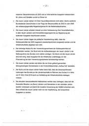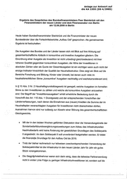 Anlage zur Antwort auf die KA 1555 (DS 4/3985) Ergebnis des Gespräches des Bundesfinanzministers Peer Steinbrück mit den ‚Finanzministern der neuen Länder und dem Finanzsenator von Berlin am 12.06.2006 in Berlin Heute haben Bundesfinanzminister Steinbrück und die Finanzminister der neuen Bundesländer über die Fortschrittsberichte „Aufbau Ost“ gesprochen. Als gemeinsames Ergebnis ist festzuhalten: Die Ausgaben des Bundes und der Länder lassen sich mit Blick auf ihre Wirkung auf . gesamtwirtschaftliche Abläufe in konsumtive und investive Ausgaben gliedern. Die Einordnung einer Ausgabe als Investition ist nicht unbedingt gleichbedeutend mit ihrer höheren Qualität gegenüber konsumtiven Ausgaben; die Höhe der Investitionen in absoluten Zahlen oder als Quote der Gesamtausgaben ist ein wichtiger wenn auch nicht der einzige Indikator hinsichtlich der Qualität der Haushaltsstruktur. Dies zeigt ein Blick auf die Bereiche Forschung und Bildung, Kinder oder Umwelt, bei denen auch viele im haushaltsrechtlichen Sinne „konsumtive“ Ausgaben nachhaltig und wachstumsrelevant sind. In& 10 Abs. 3 Nr. 2 Haushaltsgrundsätzegesetz ist geregelt, welche Ausgaben im formellen Sinne zu den Investitionen zu zählen und welche als konsumtive Ausgaben anzusehen sind. Der Begriff der "Investitionsausgaben” erhält erhebliche Bedeutung durch die Vorschrift des Art. 115 Abs. 1 Grundgesetz und der entsprechenden Vorschriften der Länderverfassungen, nach denen die Einnahmen aus (neuen) Krediten die Summe der im Haushaltsplan veranschlagten Ausgaben für Investitionen nicht überschreiten dürfen; Ausnahmen hiervon sind nur zulässig zur Abwehr einer Störung des. gesamtwirtschaftlichen .. Gleichgewichts. e Mit der iin den letzten Wochen geführten Diskussion über die Verwendungsbreite der Sonderbedarfsbundesergänzungszuweisungen zum Abbau des infrastrukturellen Nachholbedarfs wird keine Änderung der gesetzlichen Grundlagen des Solidarpakts Il angestrebt. An dem Solidarpakt II soll unverändert festgehalten werden. Er bildet die finanzielle. Grundlage für den Aufbau Ost bis 2019. « Trotz der bisher rechnerisch nur teilweisen zweckentsprechenden Verwendung der Solidarpaktmittel ist die Infrastruktur in den neuen Länder Jahr für Jahr ein gutes Stück vorangekommen. . Die Gesprächsteilnehmer waren sich darin einig, dass die teilweise Fehlverwendung nicht in erster Linie Folge zu geringer Infrastrukturinvestitionen ist, sondern auf die