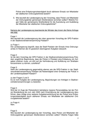 Polizei eine Entlastungsnotwendigkeit durch stärkeren Einsatz von Mitarbeiter der städtischen Ordnungsbehörde besteht? 5. Wie beurteilt die Landesregierung den Vorschlag, dass Polizei und Mitarbeiter der Ordnungsämter gemeinsam Streifendienst verrichten sollten? Welche Fol- gen hätte der gemeinsame Streifendienst für die Ausrüstung und Ausbildung der Mitarbeiter der städtischen Ordnungsbehörde? Namens der Landesregierung beantwortet der Minister des Innern die Kleine Anfrage wie folgt: Frage 1: Wie beurteilt die Landesregierung den oben genannten Vorschlag der SPD-Fraktion in der Stadtverordnetenversammlung Potsdam? zu Frage 1: Die Landesregierung begrüßt, dass die Stadt Potsdam den Einsatz ihres Ordnungs- amtes im Rahmen der ihr gesetzlich übertragenen Aufgaben überprüft. Frage 2: Ist die dem Vorschlag der SPD-Fraktion in der Stadtverordnetenversammlung Pots- dam angeführte Begründung, dass die Polizei in Potsdam eine Entlastung von Auf- gaben erfahren muss, um sich auf die Verhinderung und Aufklärung von Straftaten konzentrieren zu können, zutreffend? Frage 3: Sieht die Landesregierung gegenwärtig ebenso wie die SPD-Fraktion in der Stadt- verordnetenversammlung Potsdam die Notwendigkeit einer Entlastung der Polizei in der Landeshauptstadt Potsdam? zu den Fragen 2 und 3: Es ist nicht Aufgabe der Landesregierung, Begründungen von Anträgen in Stadtver- ordnetenversammlungen zu bewerten. Frage 4: Wird der im Zuge der Polizeireform betriebene massive Personalabbau bei der Poli- zei Brandenburg bis zum Jahr 2020 nach Einschätzung der Landesregierung dazu führen, dass infolge einer weiteren Aufgabenverdichtung bei der Polizei eine Entlas- tungsnotwendigkeit durch stärkeren Einsatz von Mitarbeiter der städtischen Ord- nungsbehörde besteht? zu Frage 4: Nein. Frage 5: Wie beurteilt die Landesregierung den Vorschlag, dass Polizei und Mitarbeiter der Ordnungsämter gemeinsam Streifendienst verrichten sollten? Welche Folgen hätte